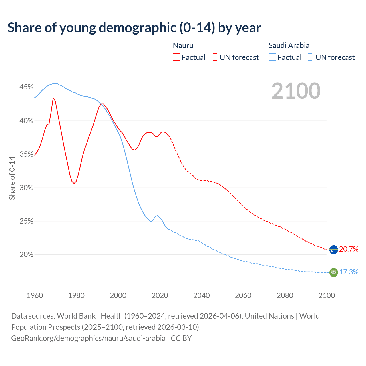 - The share of young demographic (0-15 years old) in Nauru is 37.8% vs 23.8% in Saudi Arabia.