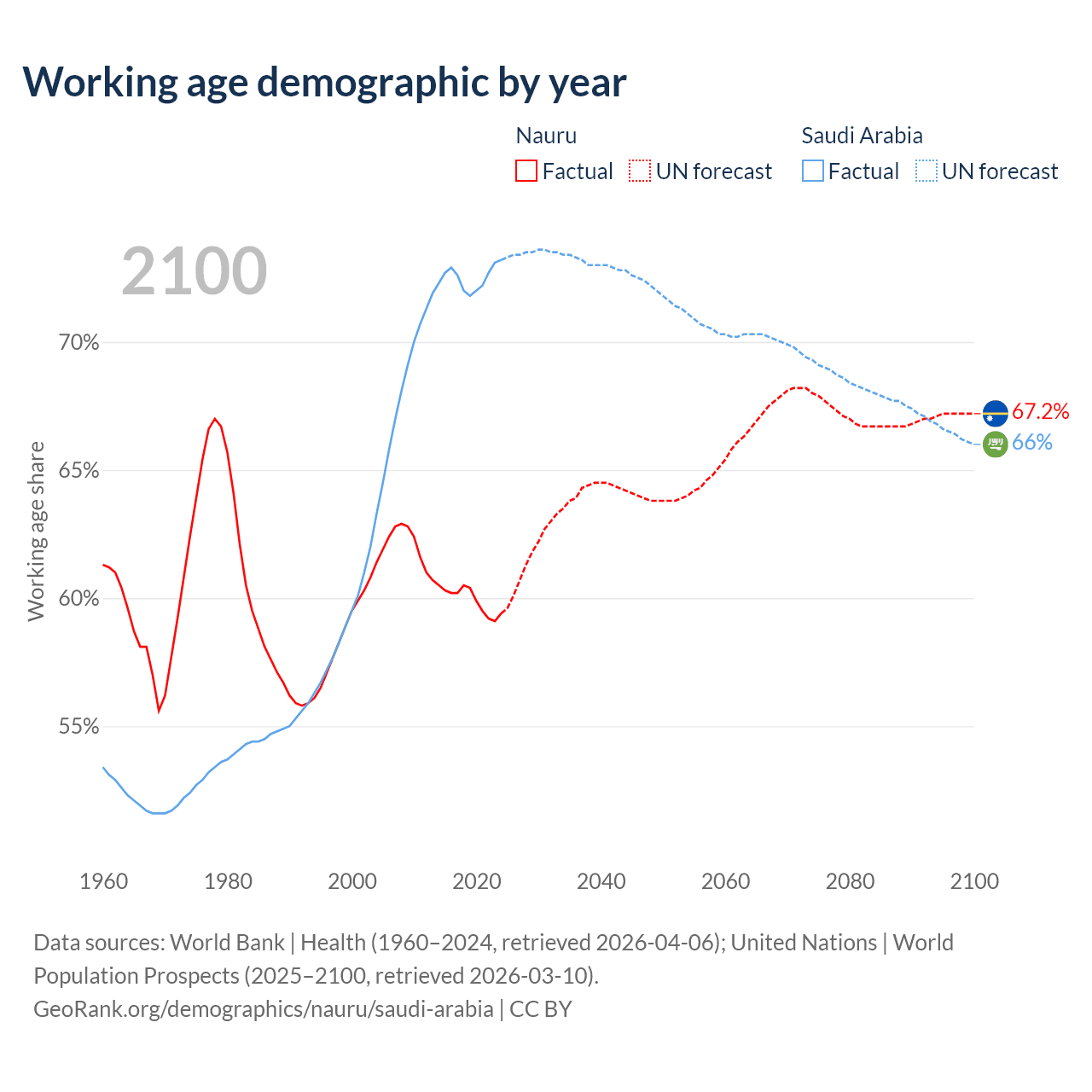- Nauru has 7.2K working age adults (aged 15-64) vs 26.9M in Saudi Arabia.