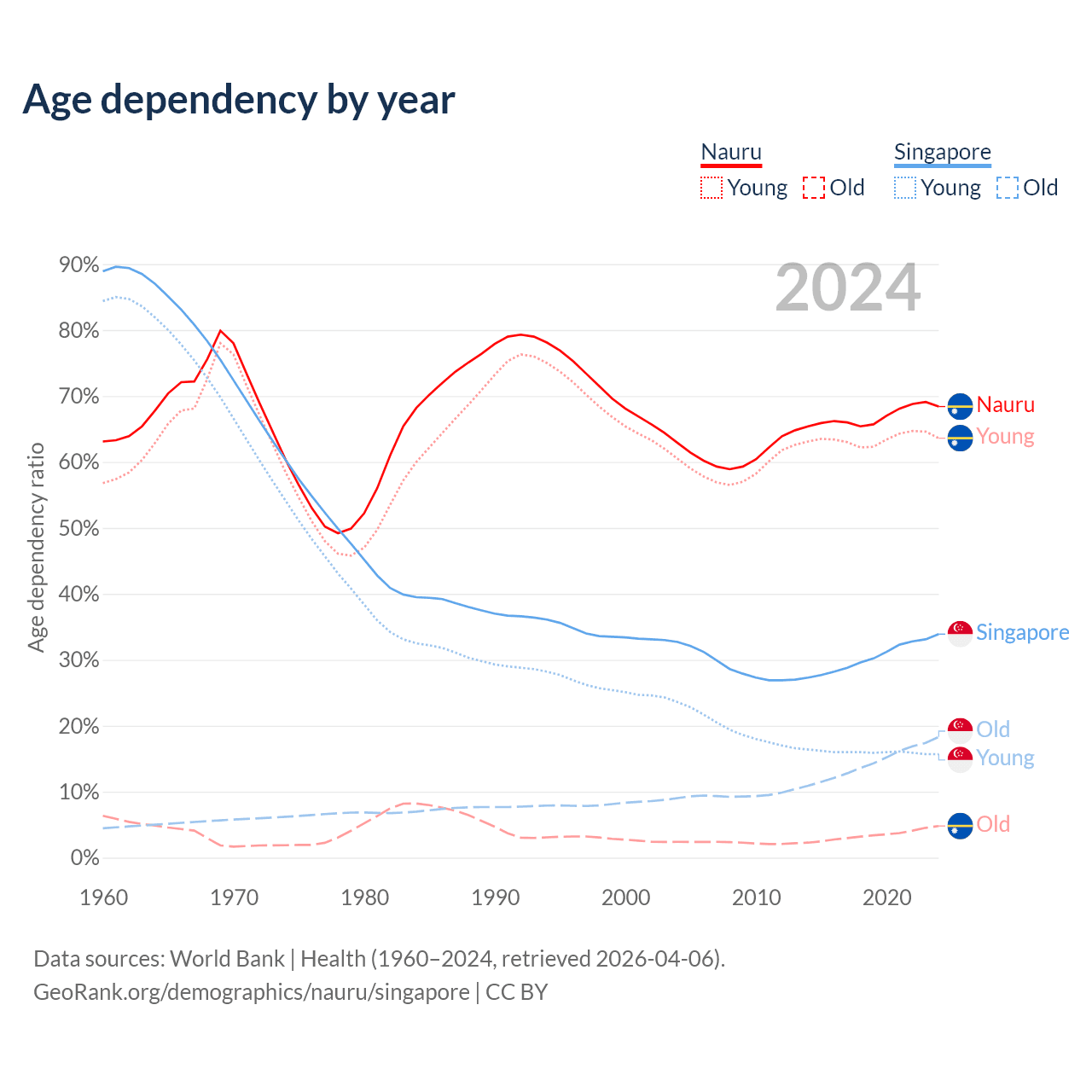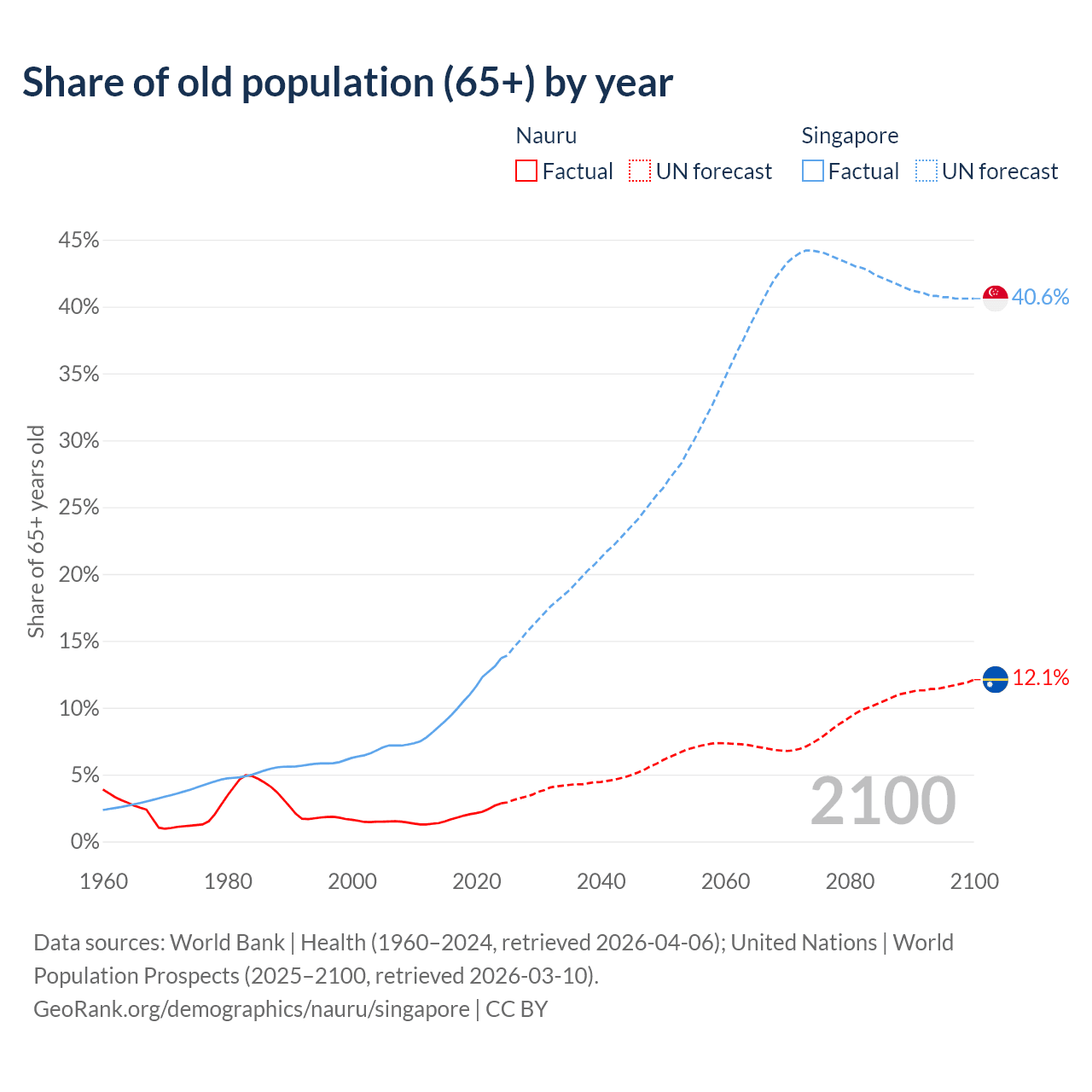 The share of older people aged 65 and over is 2.85% in Nauru and 13.7% in Singapore. Life expectancy in Nauru compared to Singapore .