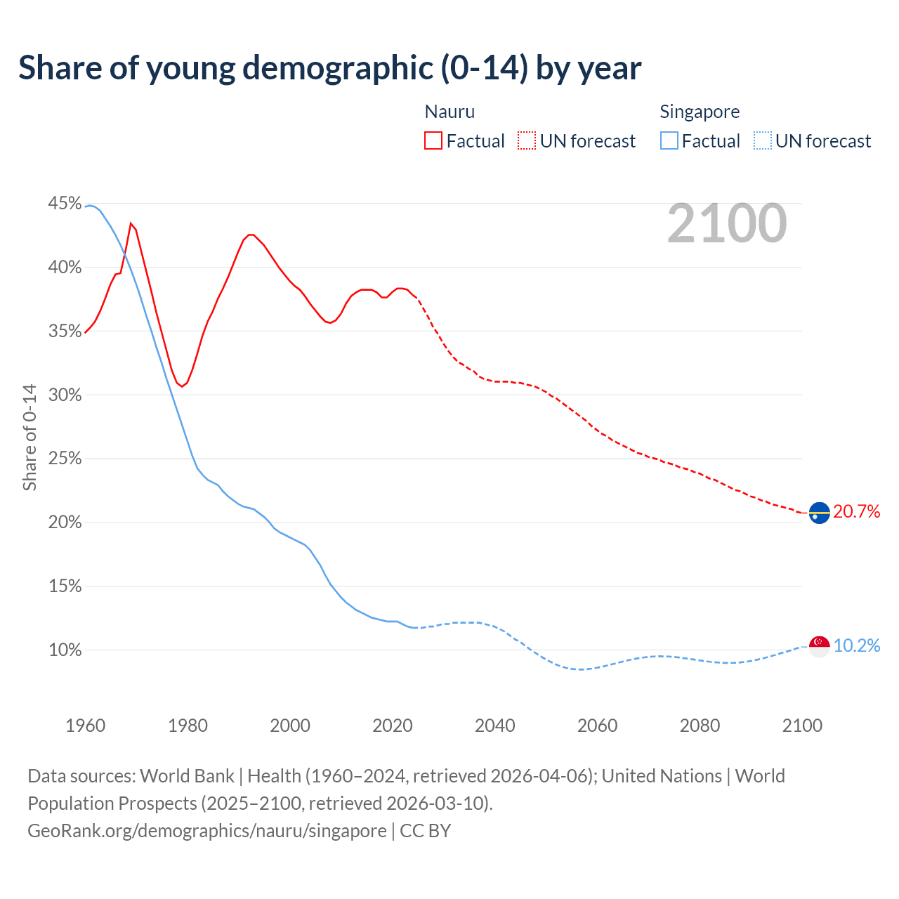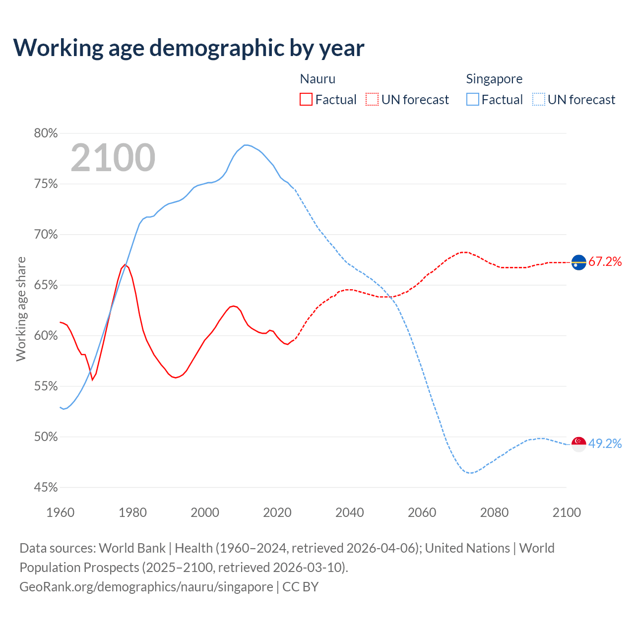 Median age Nauru vs Singapore, 1960-2100