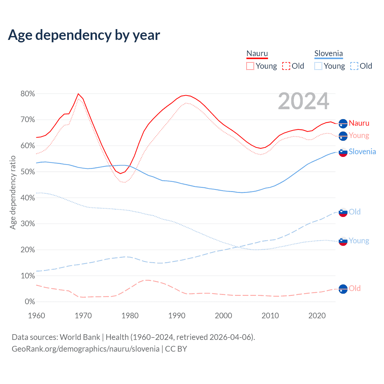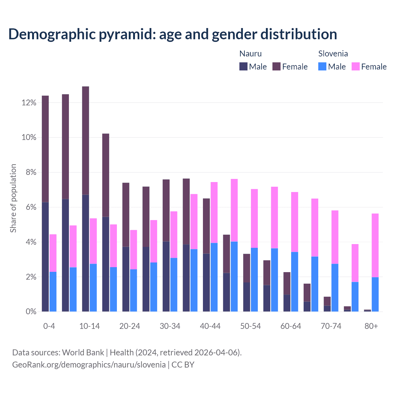 - The share of old-age demographic (65+) in Nauru is 2.85% vs 21.8% in Slovenia.
