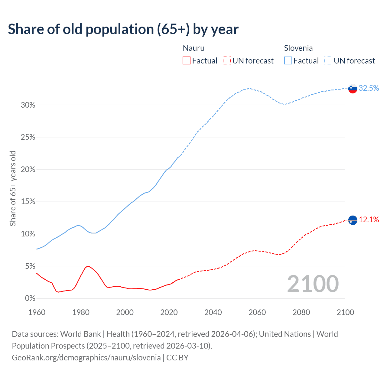 The share of older people aged 65 and over is 2.85% in Nauru and 21.8% in Slovenia. Life expectancy in Nauru compared to Slovenia .