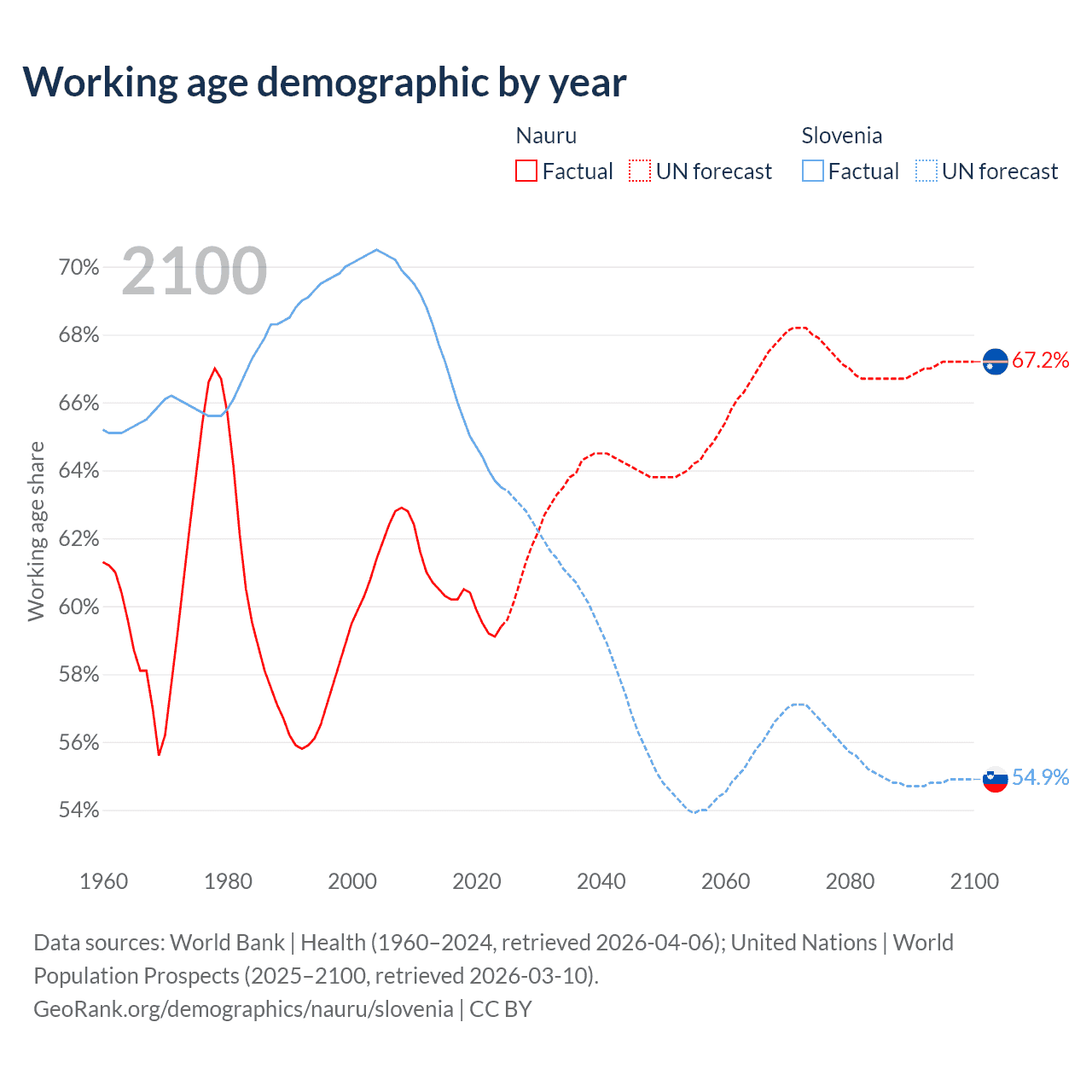 - Nauru has 7.2K working age adults (aged 15-64) vs 1.35M in Slovenia.