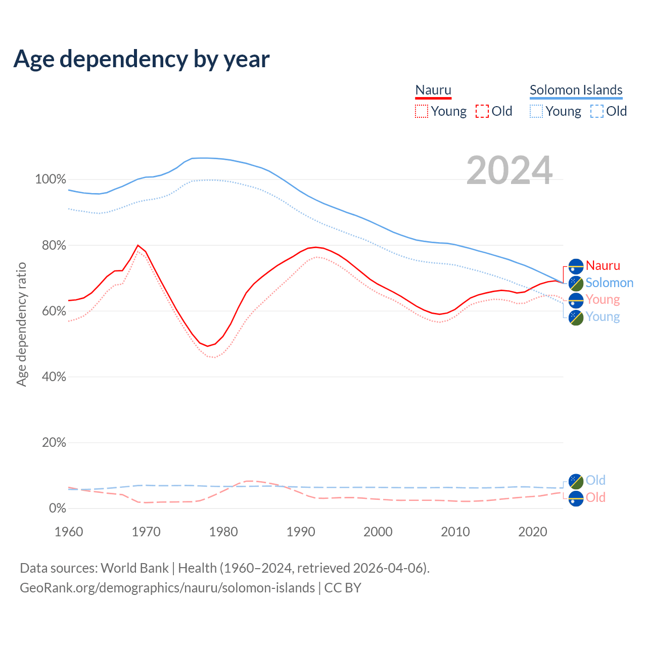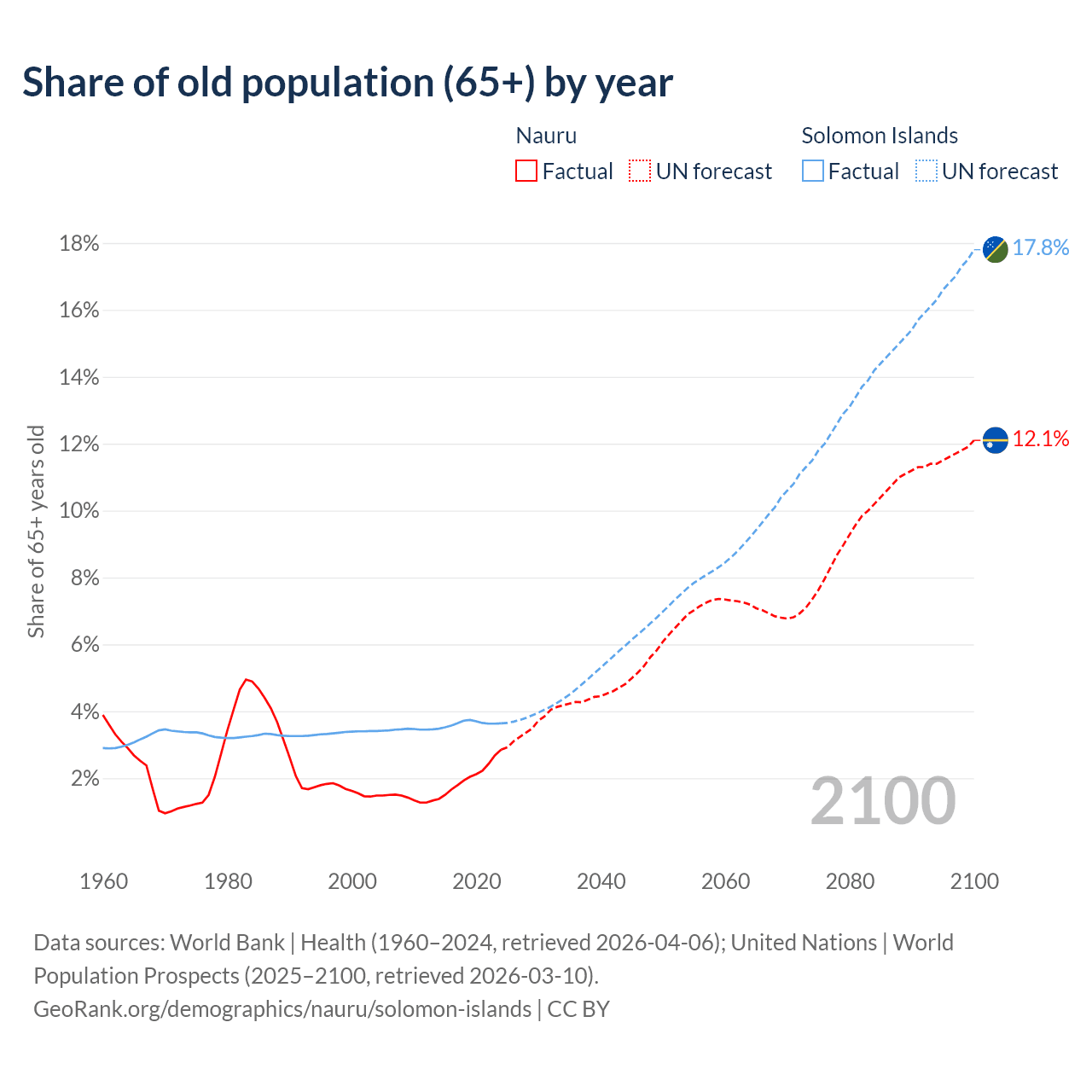The share of older people aged 65 and over is 2.85% in Nauru and 3.64% in the Solomon Islands. Life expectancy in Nauru compared to the Solomon Islands .