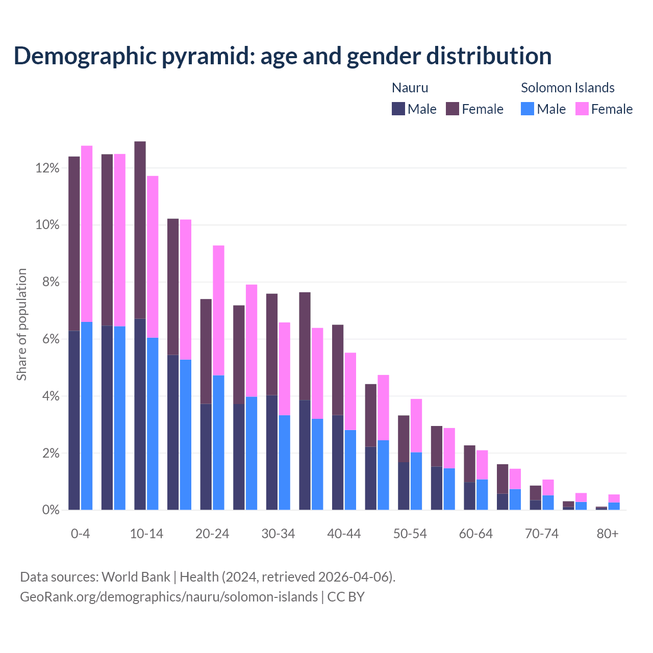 - Nauru is ranked 155/196 by median age (oldest to youngest) vs 153/196 for the Solomon Islands.
