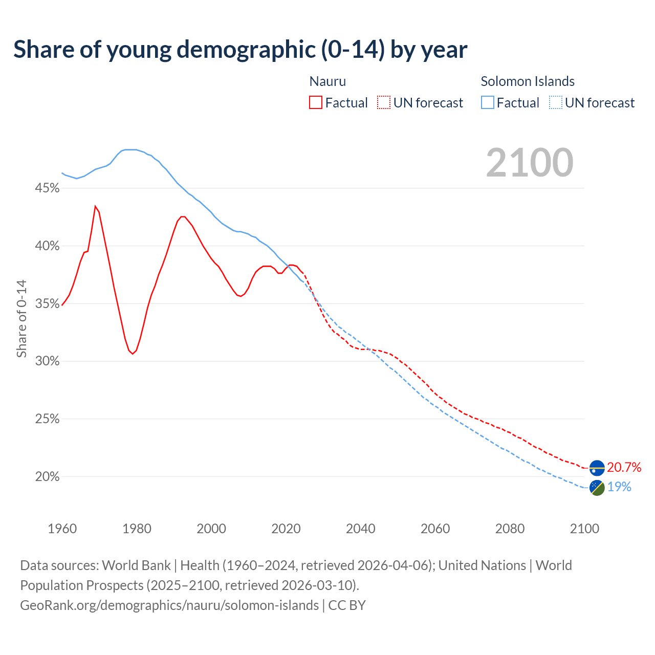 - The share of young demographic (0-15 years old) in Nauru is 37.8% vs 37% in the Solomon Islands.