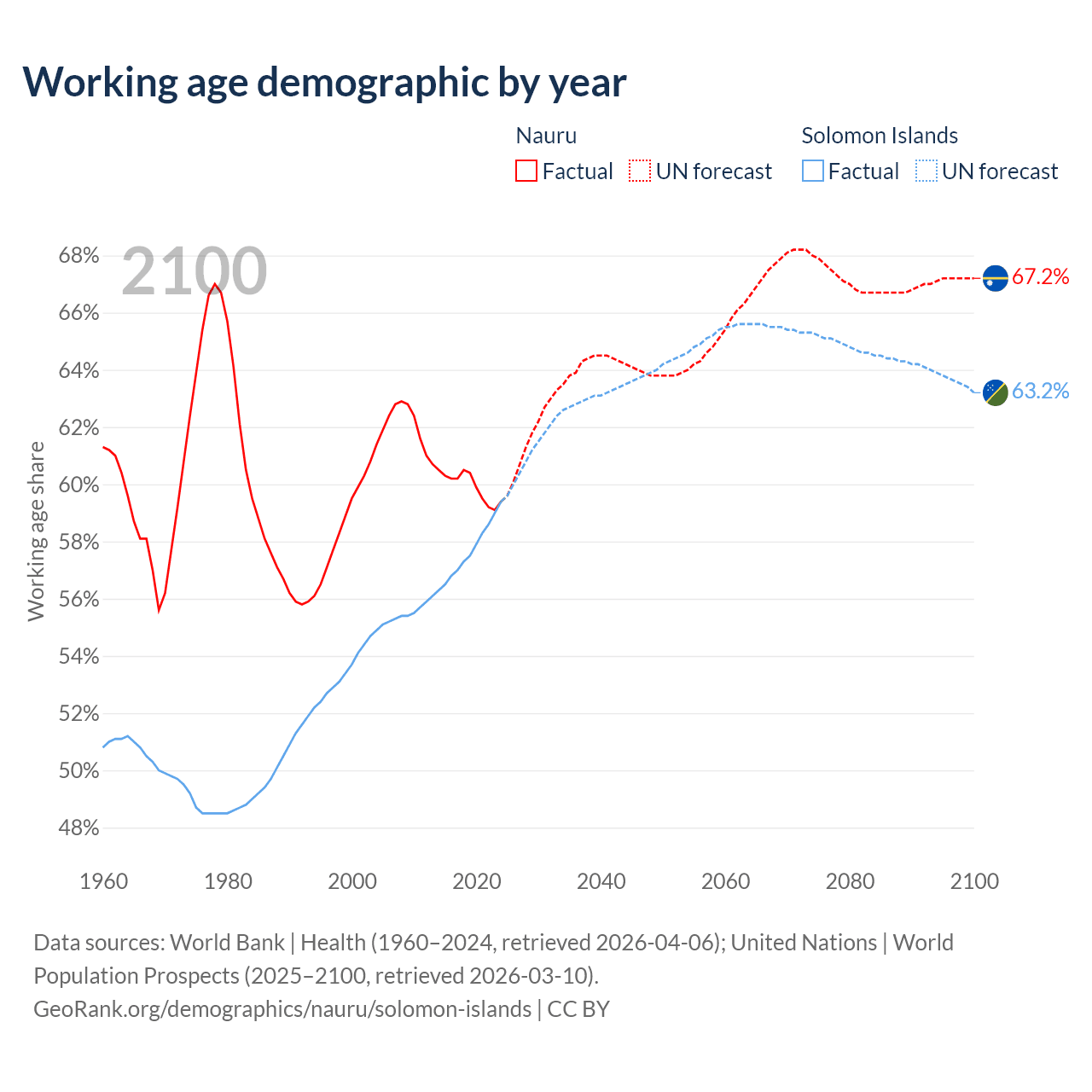 - Nauru has 7.2K working age adults (aged 15-64) vs 513K in the Solomon Islands.