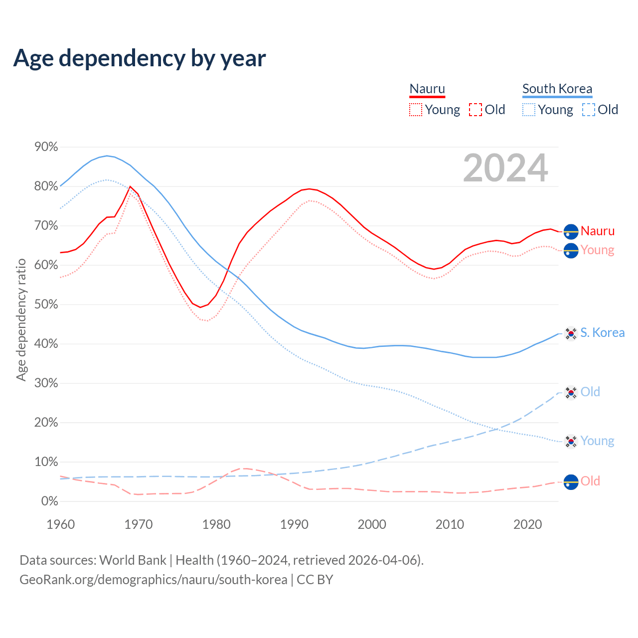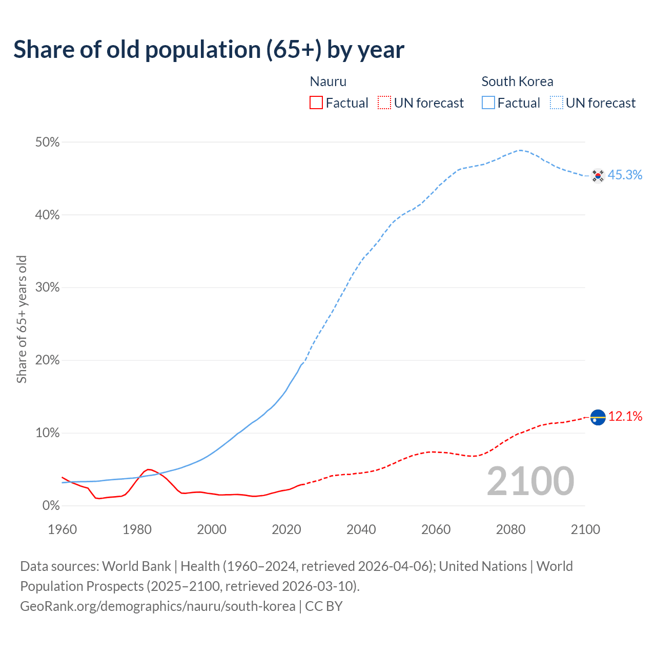 The share of older people aged 65 and over is 2.85% in Nauru and 19.3% in South Korea. Life expectancy in Nauru compared to South Korea .