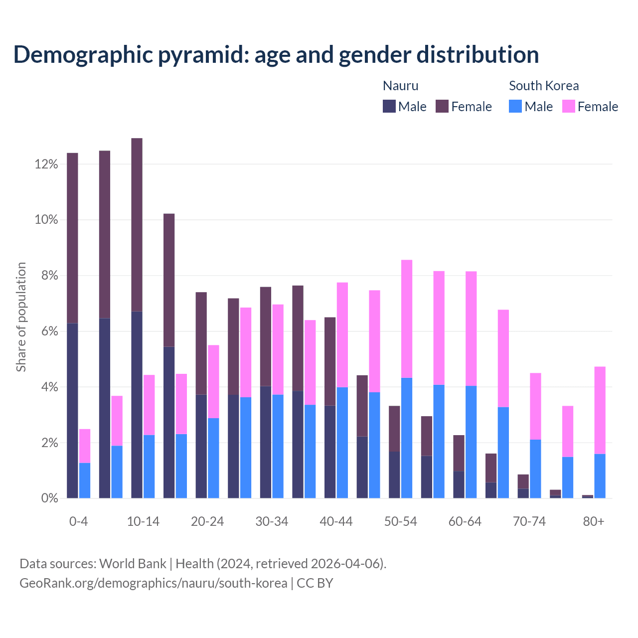- Nauru is ranked 155/196 by median age (oldest to youngest) vs 10/196 for South Korea.