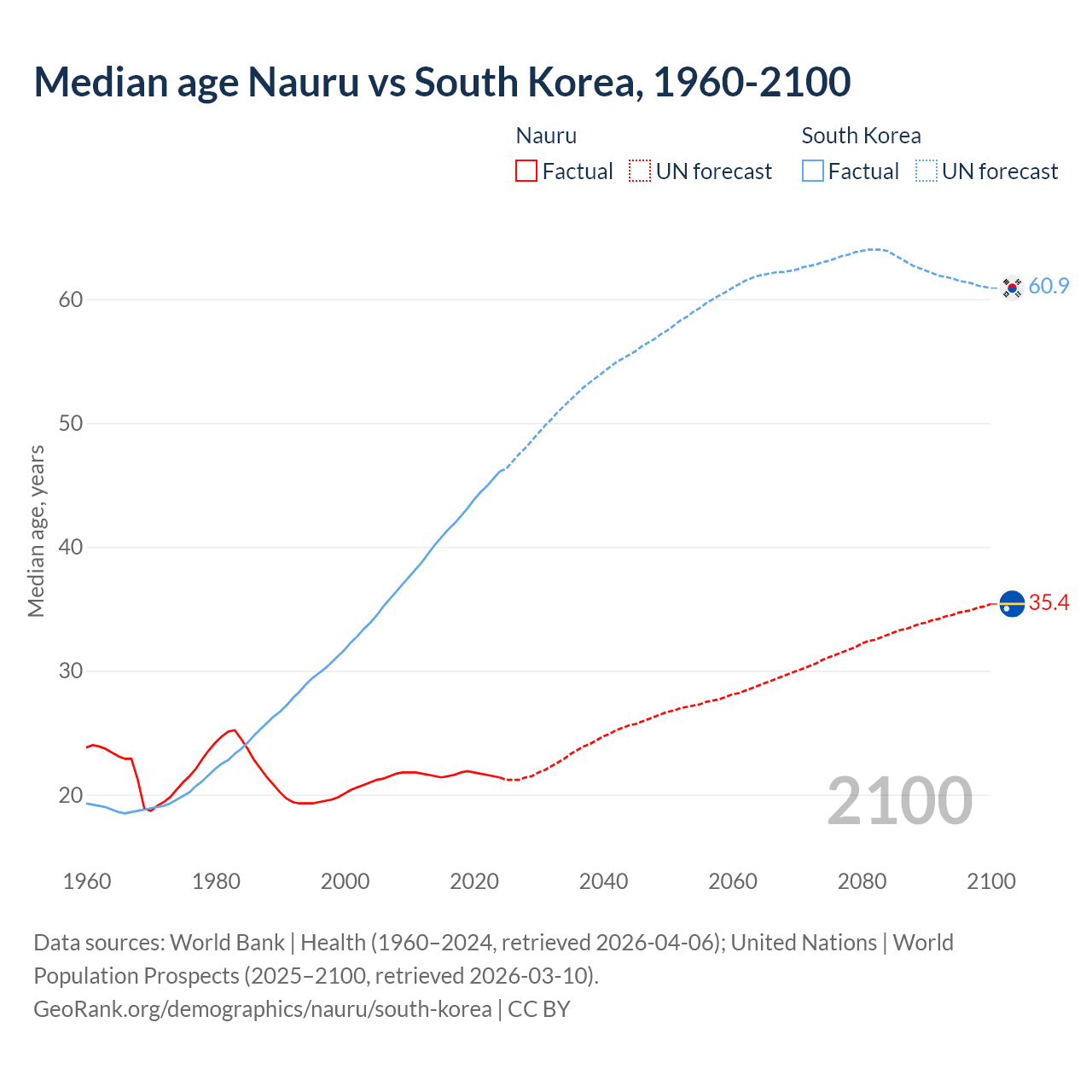 - The median age in Nauru is 21.4 years compared to 46.1 years in South Korea.