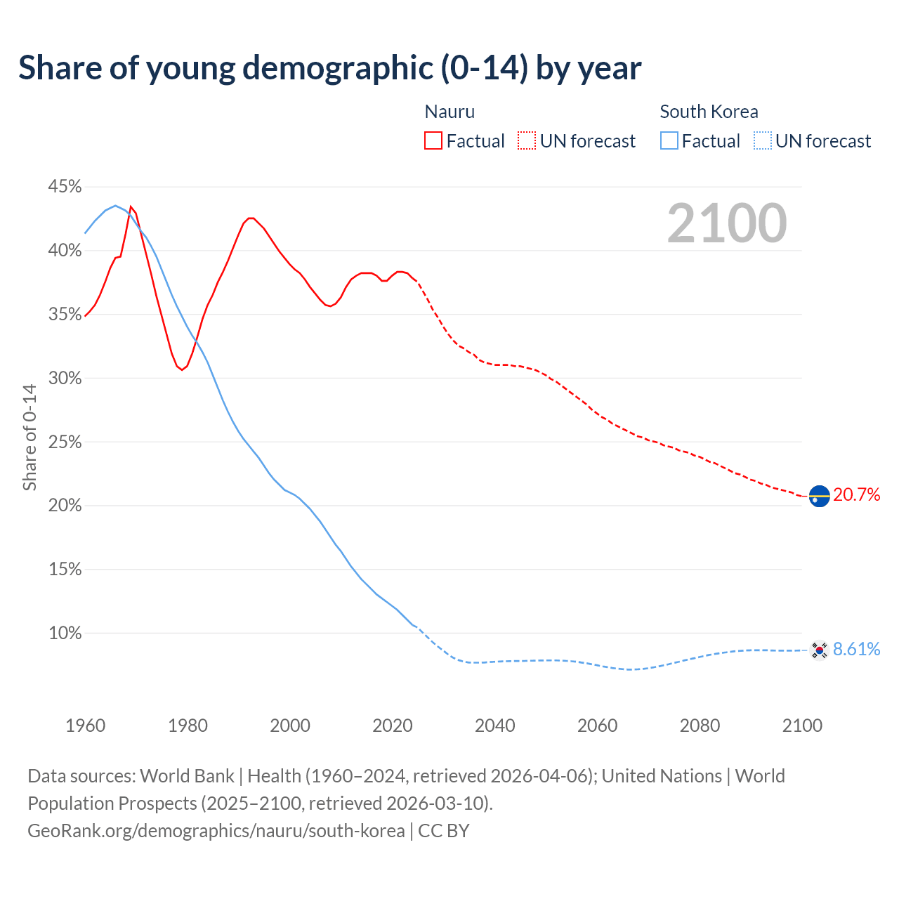 - The share of young demographic (0-15 years old) in Nauru is 37.8% vs 10.6% in South Korea.