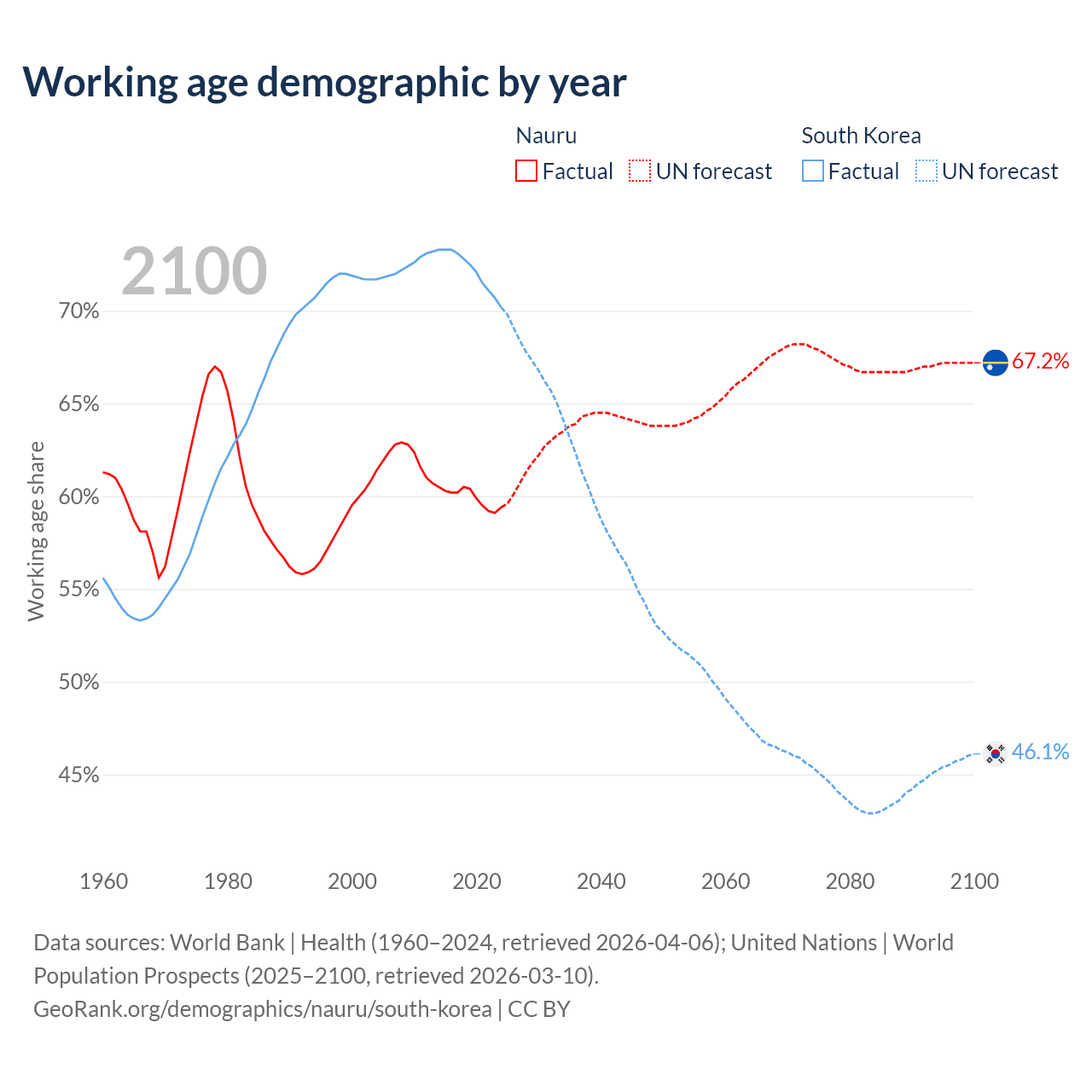 - Nauru has 7.2K working age adults (aged 15-64) vs 36.2M in South Korea.