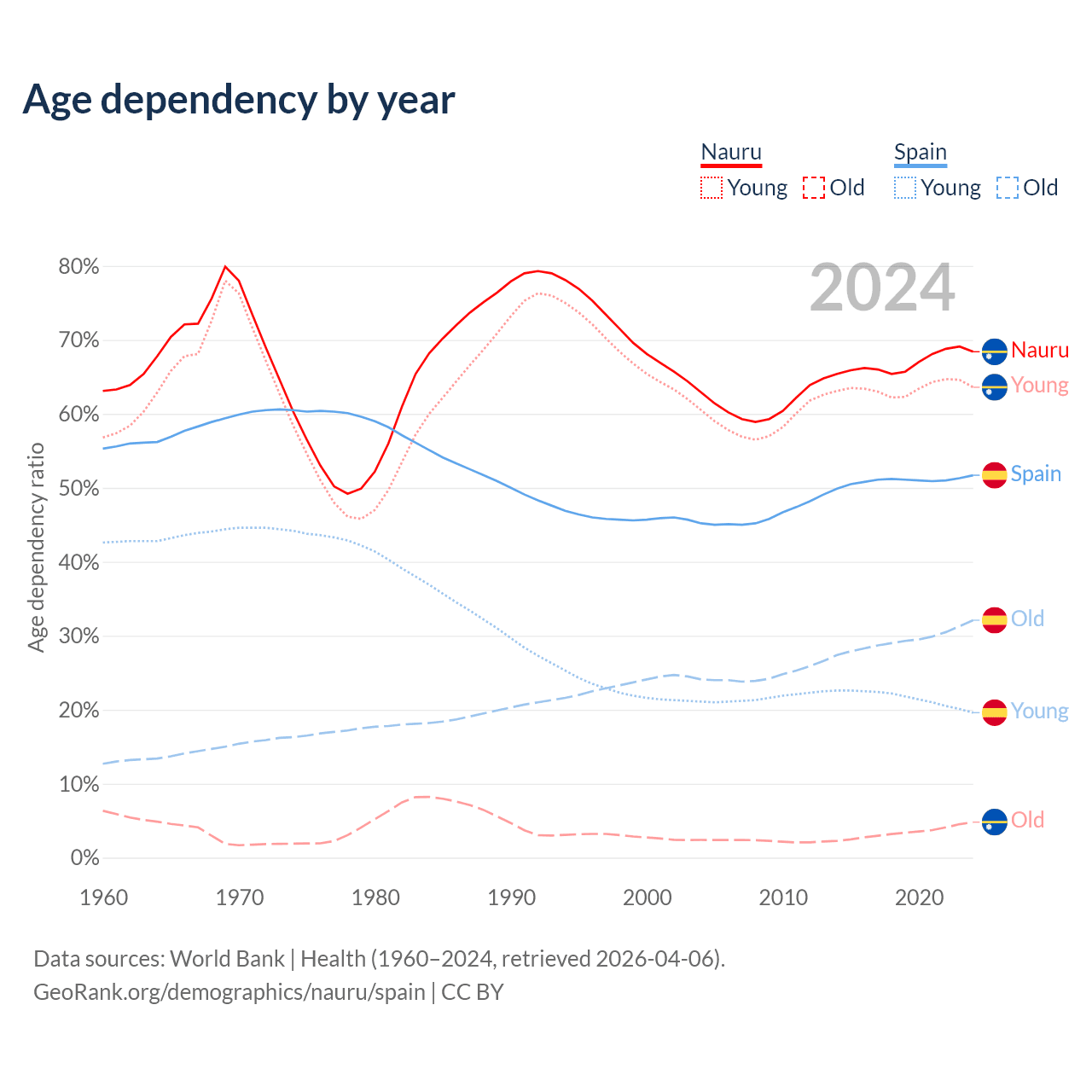 - The share of old-age demographic (65+) in Nauru is 2.85% vs 21.1% in Spain.