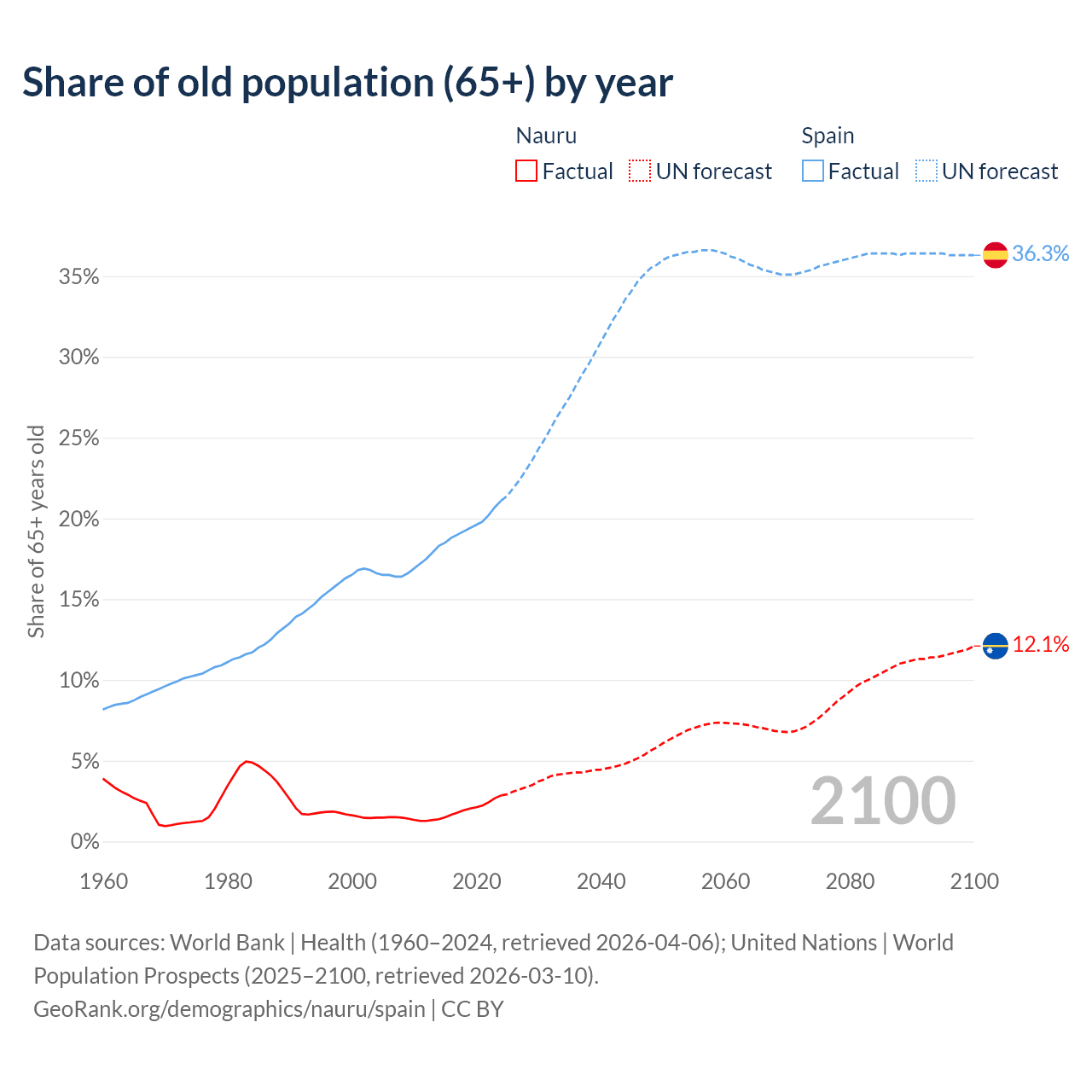 The share of older people aged 65 and over is 2.85% in Nauru and 21.1% in Spain. Life expectancy in Nauru compared to Spain .