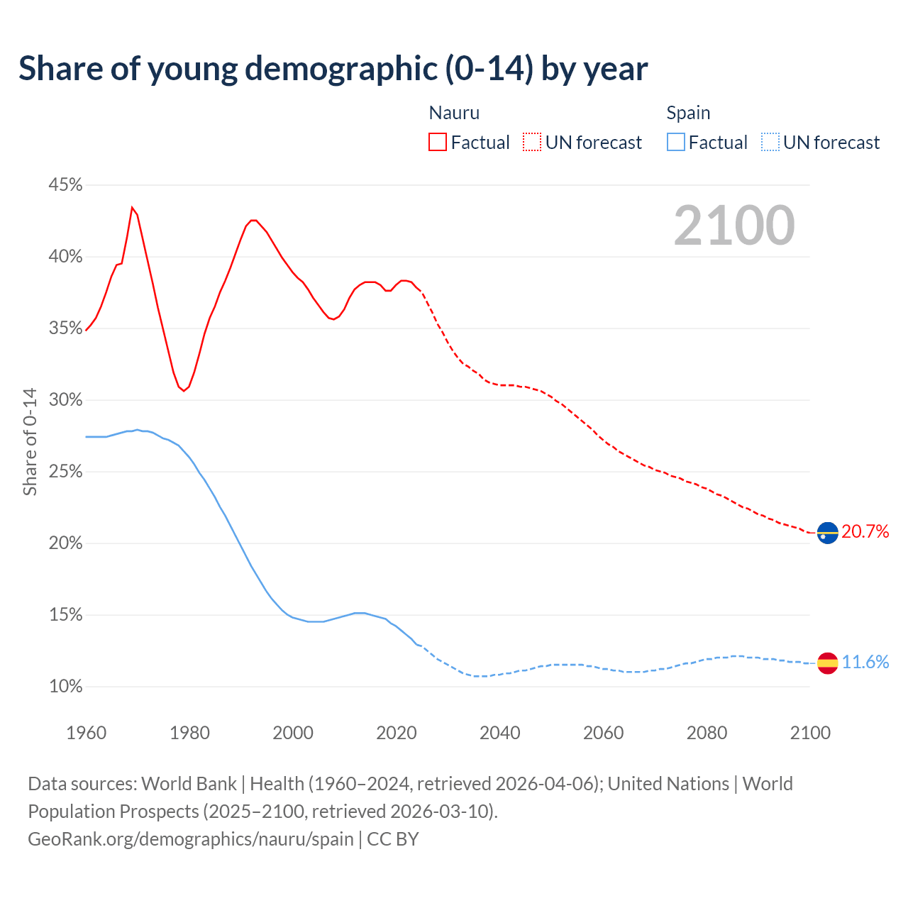 - The share of young demographic (0-15 years old) in Nauru is 37.8% vs 12.9% in Spain.