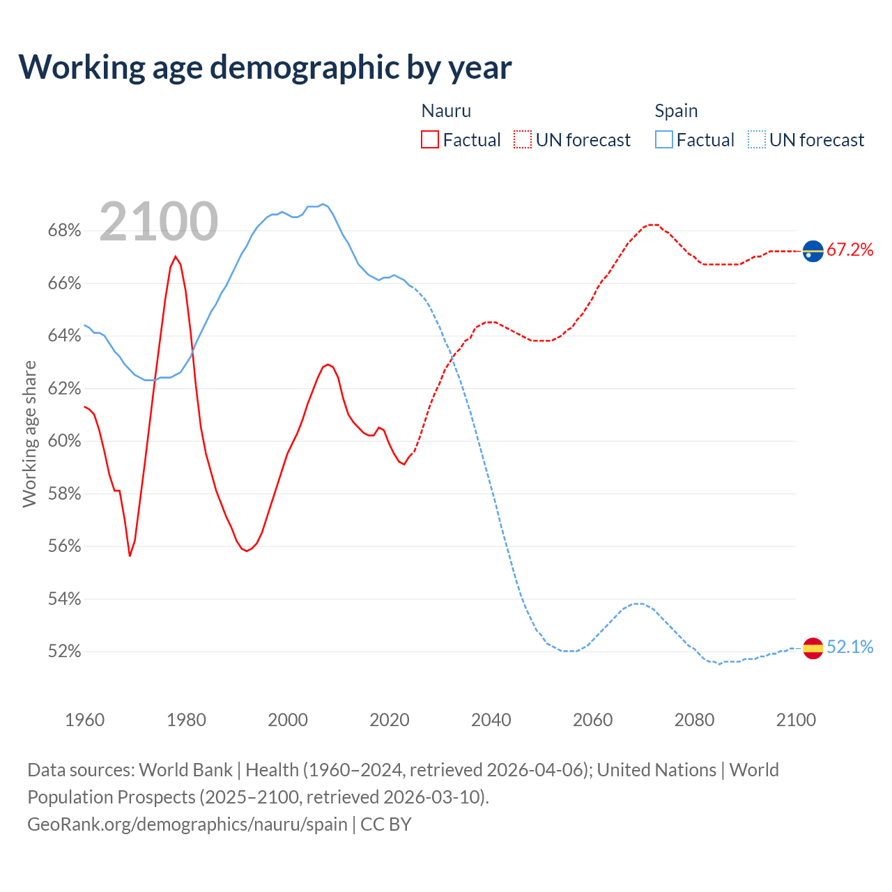 - Nauru has 7.2K working age adults (aged 15-64) vs 32.2M in Spain.