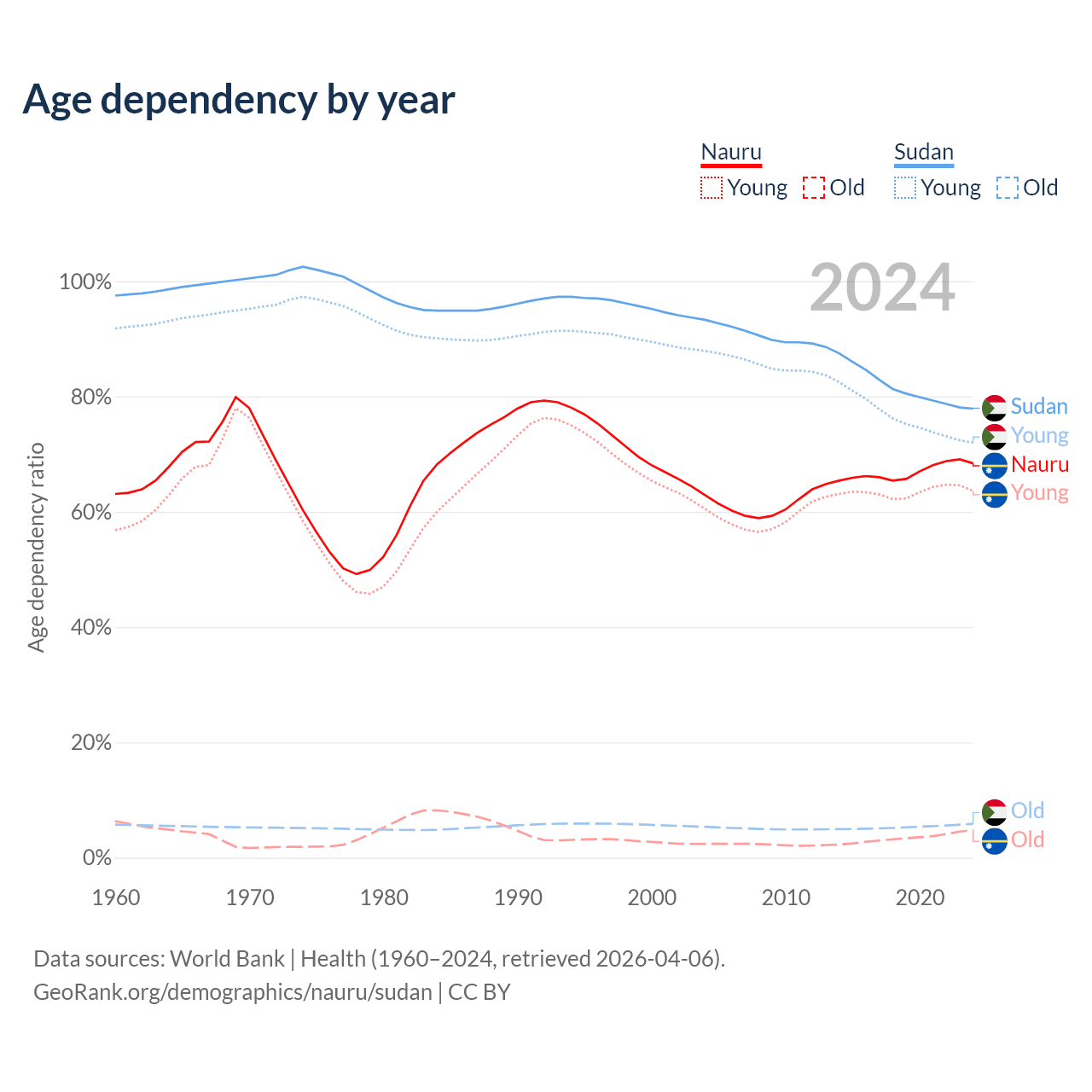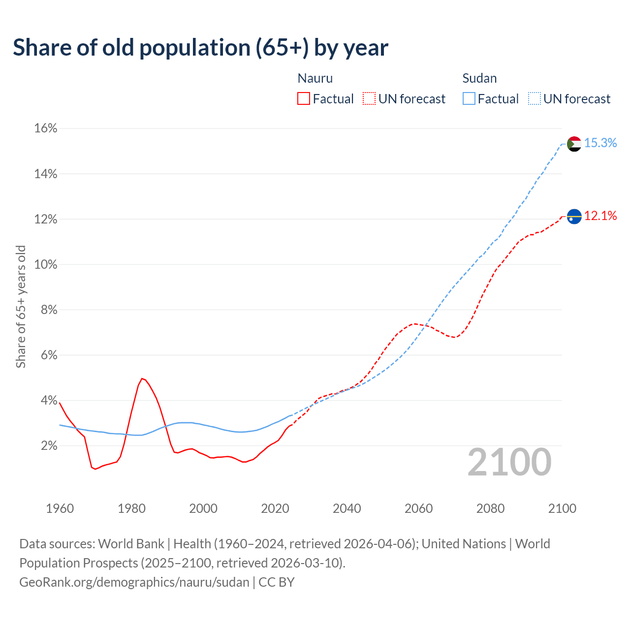 - The share of old-age demographic (65+) in Nauru is 2.85% vs 3.3% in Sudan.