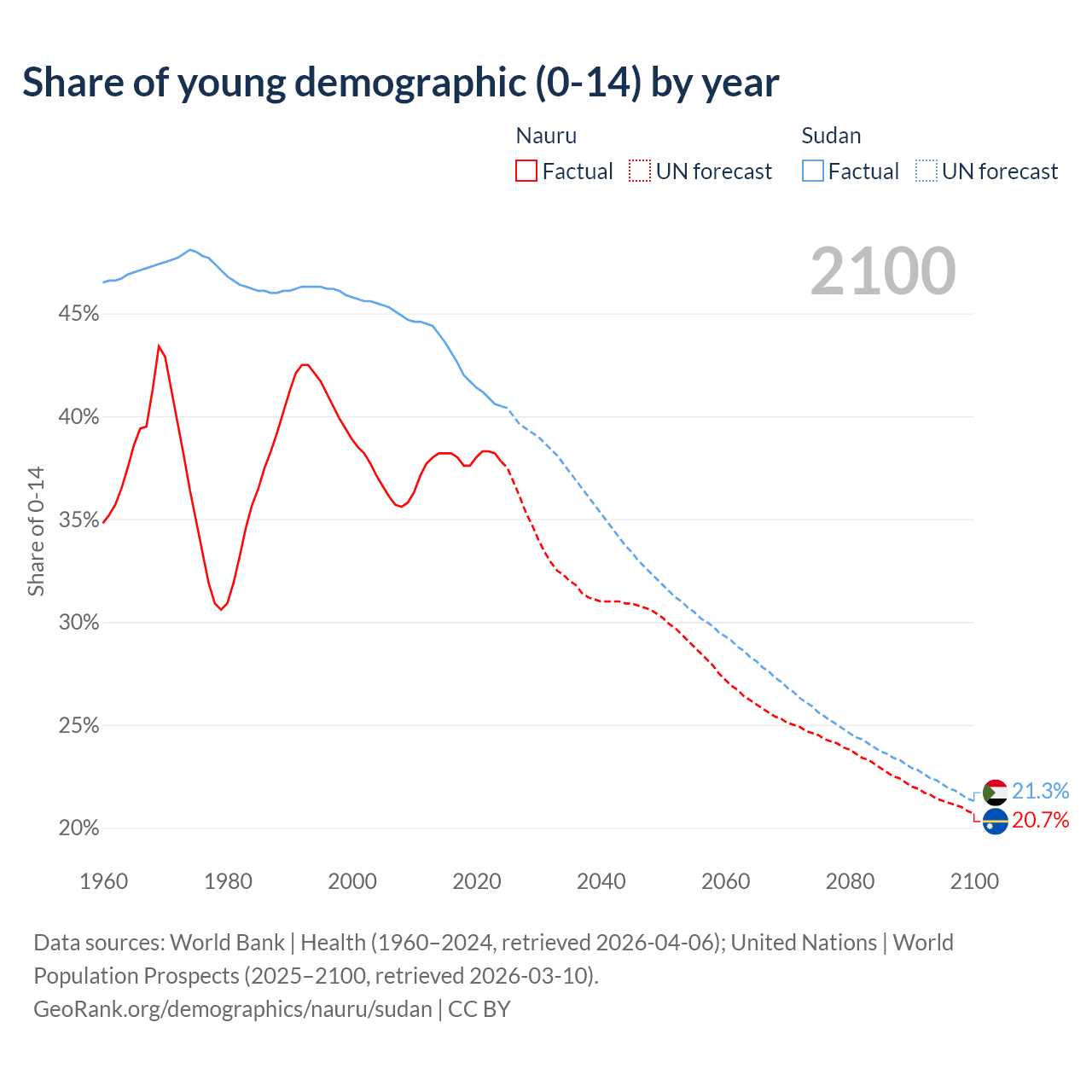 - The share of young demographic (0-15 years old) in Nauru is 37.8% vs 40.5% in Sudan.