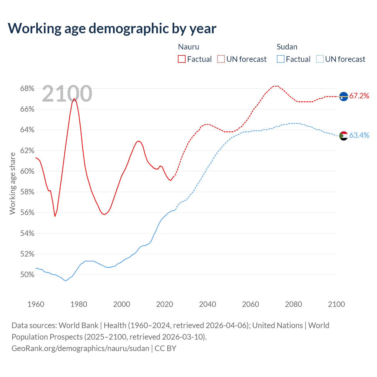 - Nauru has 7.2K working age adults (aged 15-64) vs 30M in Sudan.