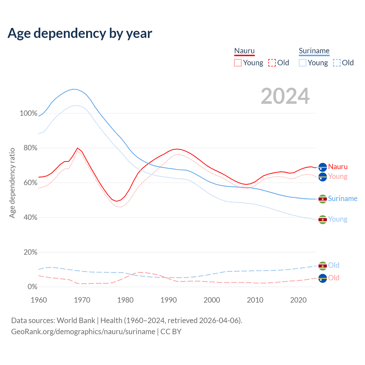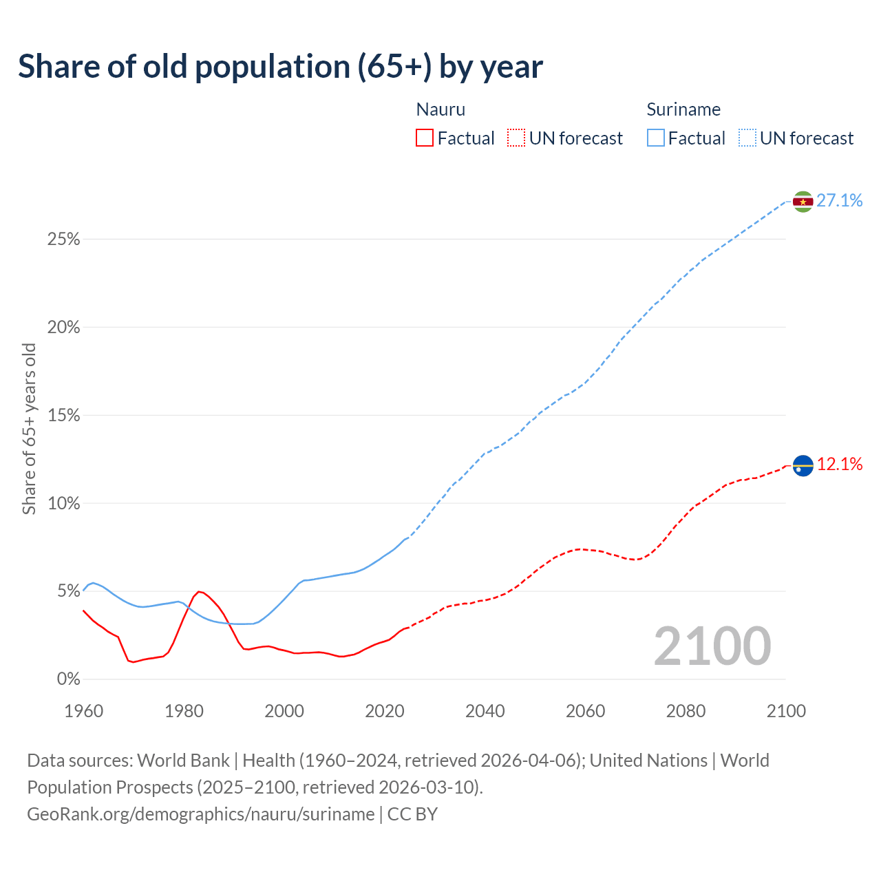 - The share of old-age demographic (65+) in Nauru is 2.85% vs 7.9% in Suriname.