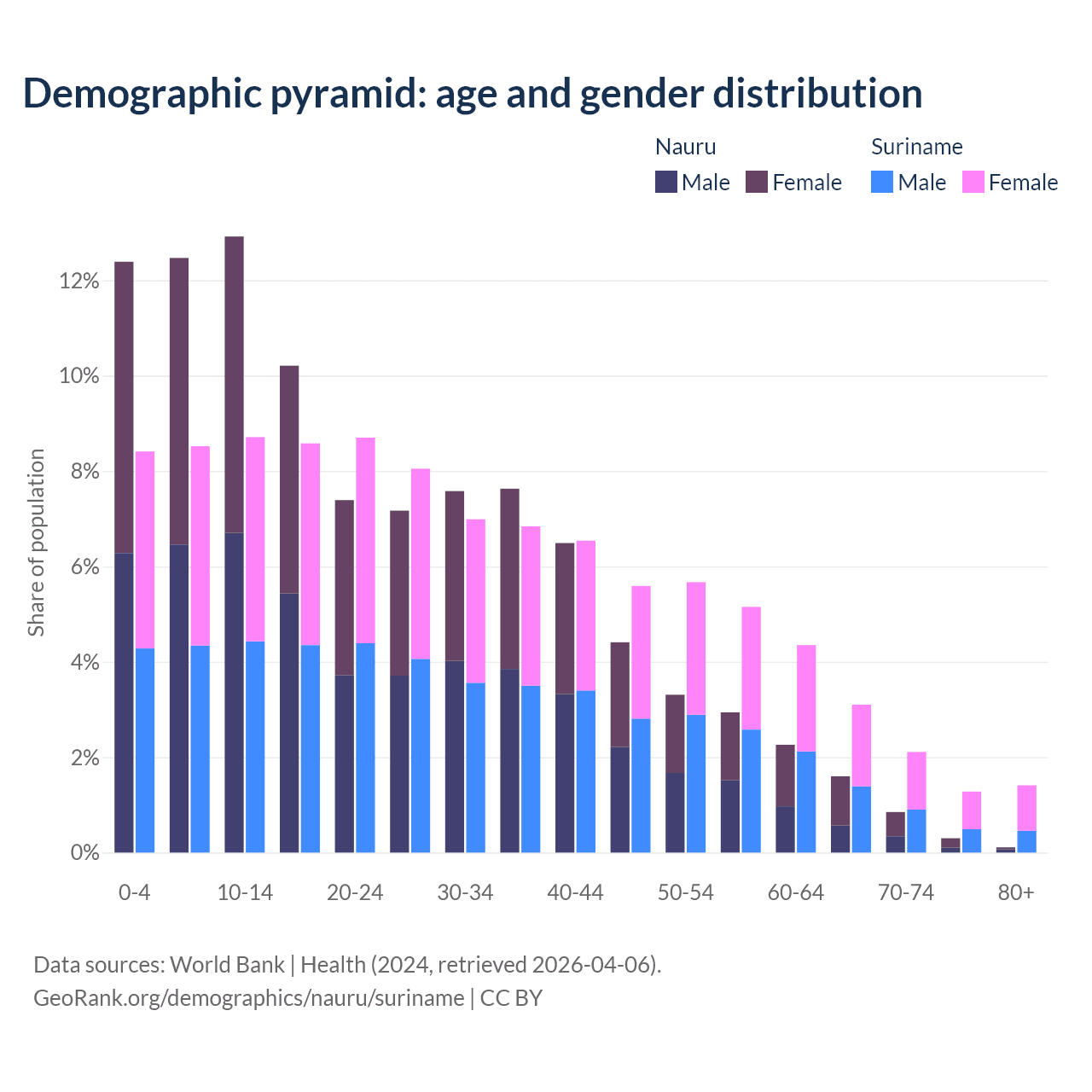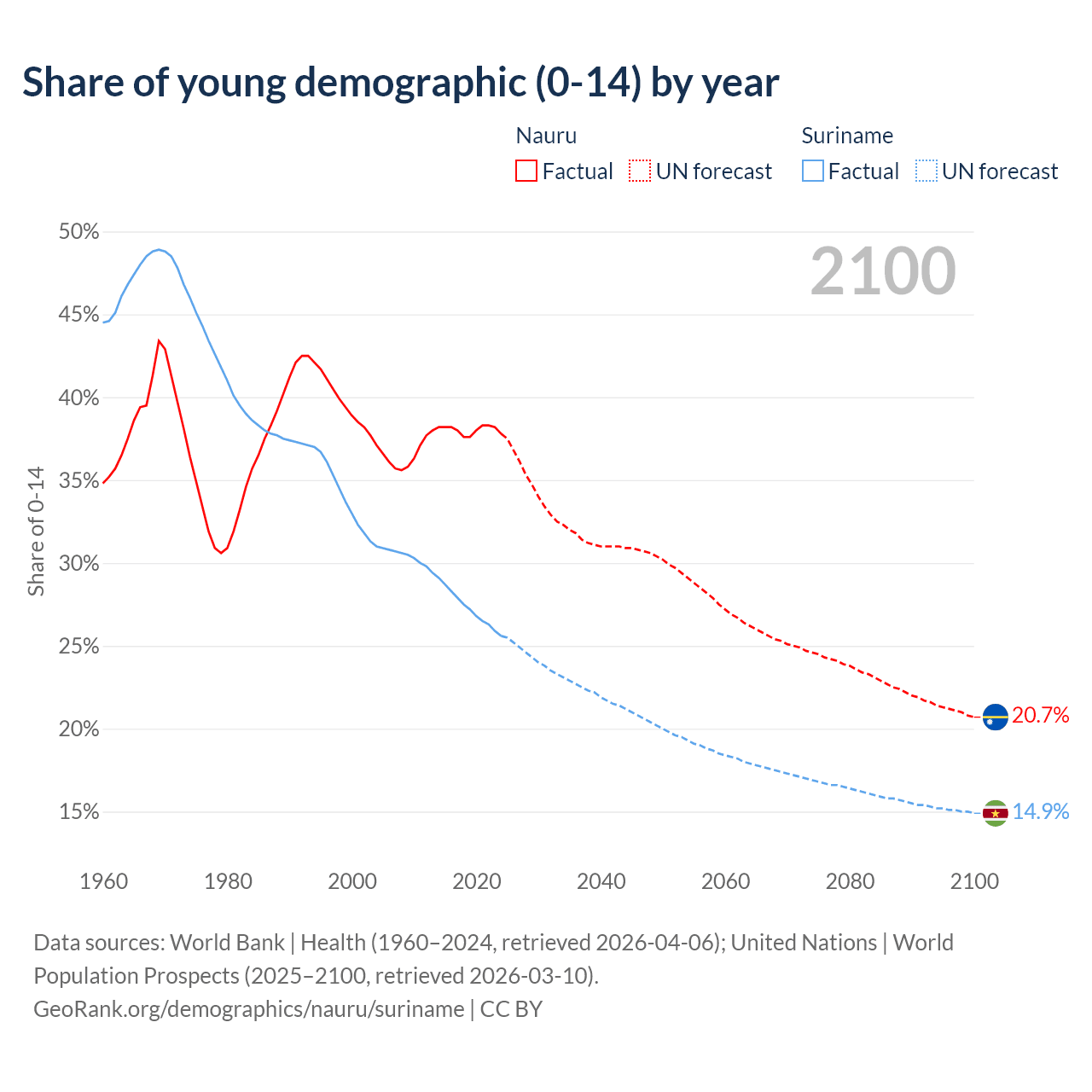 - The share of young demographic (0-15 years old) in Nauru is 37.8% vs 25.6% in Suriname.