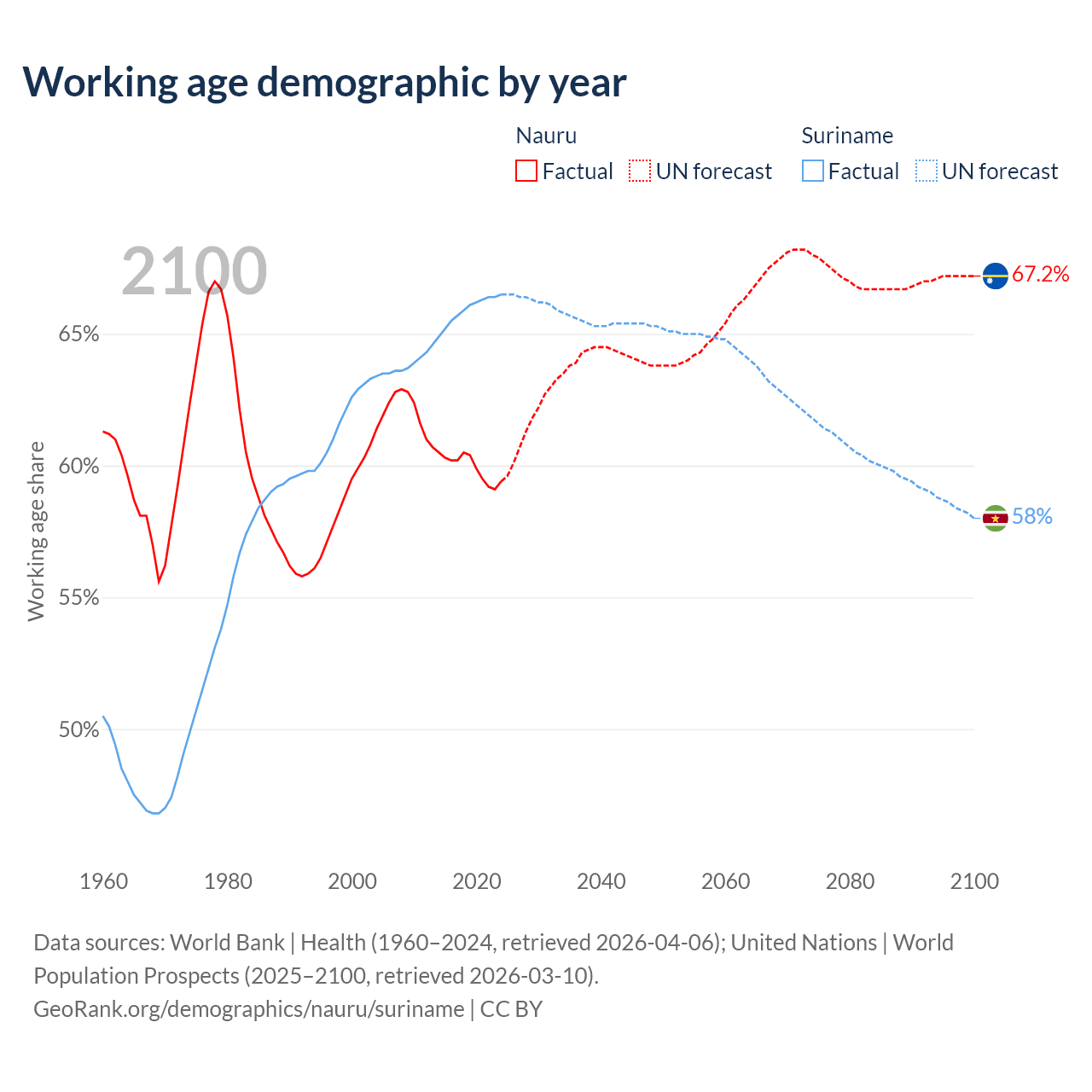 - Nauru has 7.2K working age adults (aged 15-64) vs 430K in Suriname.