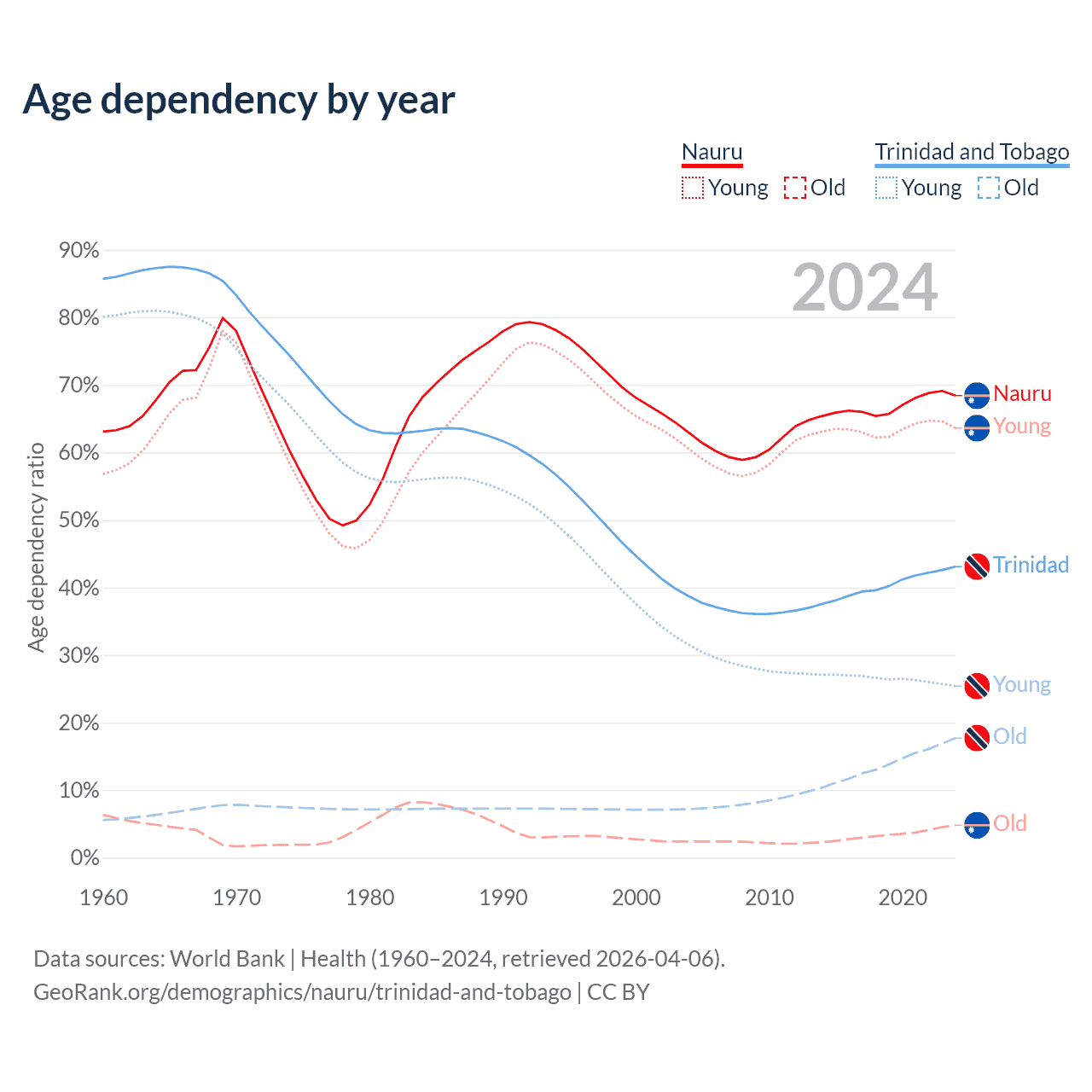 - The share of old-age demographic (65+) in Nauru is 2.85% vs 12.4% in Trinidad and Tobago.