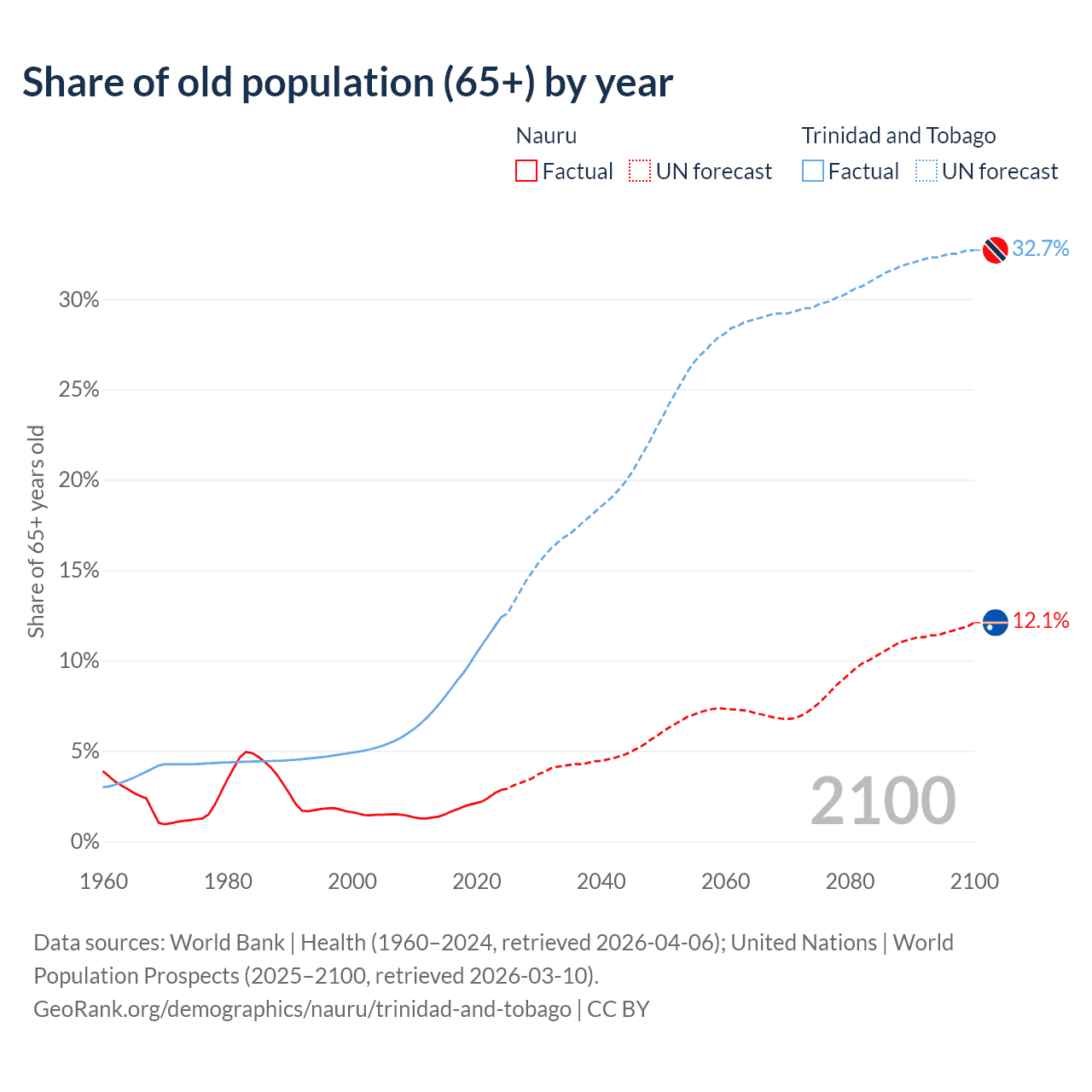 The share of older people aged 65 and over is 2.85% in Nauru and 12.4% in Trinidad and Tobago. Life expectancy in Nauru compared to Trinidad and Tobago .