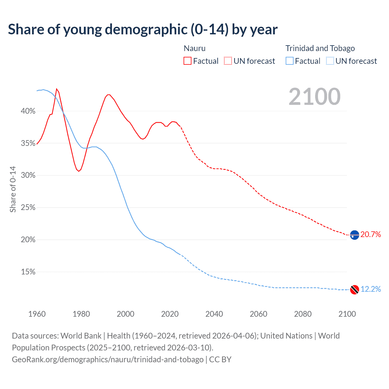 - The share of young demographic (0-15 years old) in Nauru is 37.8% vs 17.8% in Trinidad and Tobago.