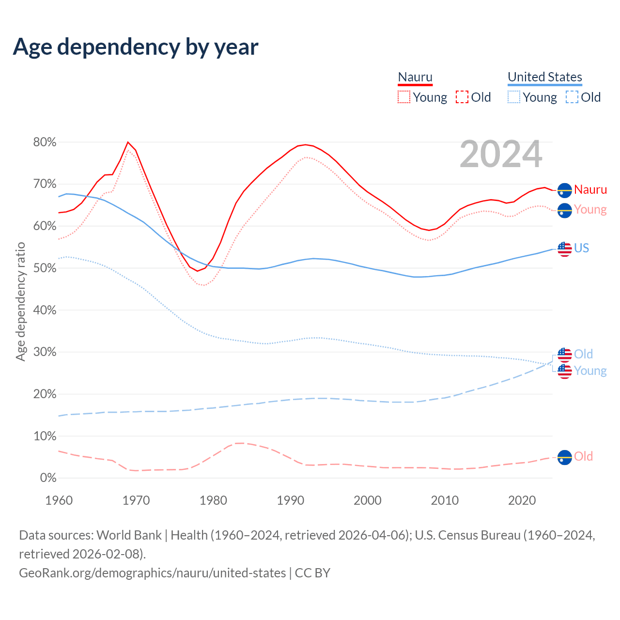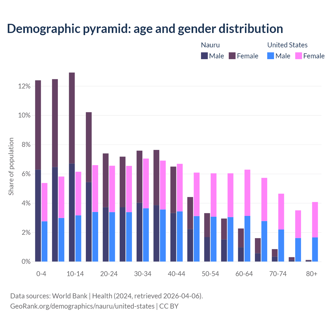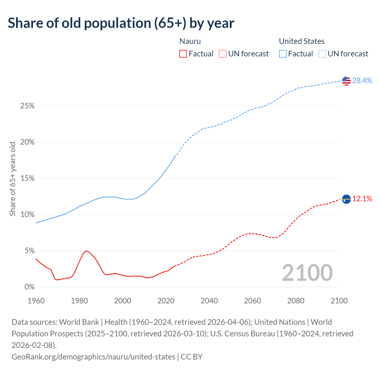 - The share of old-age demographic (65+) in Nauru is 2.85% vs 17.9% in the United States.