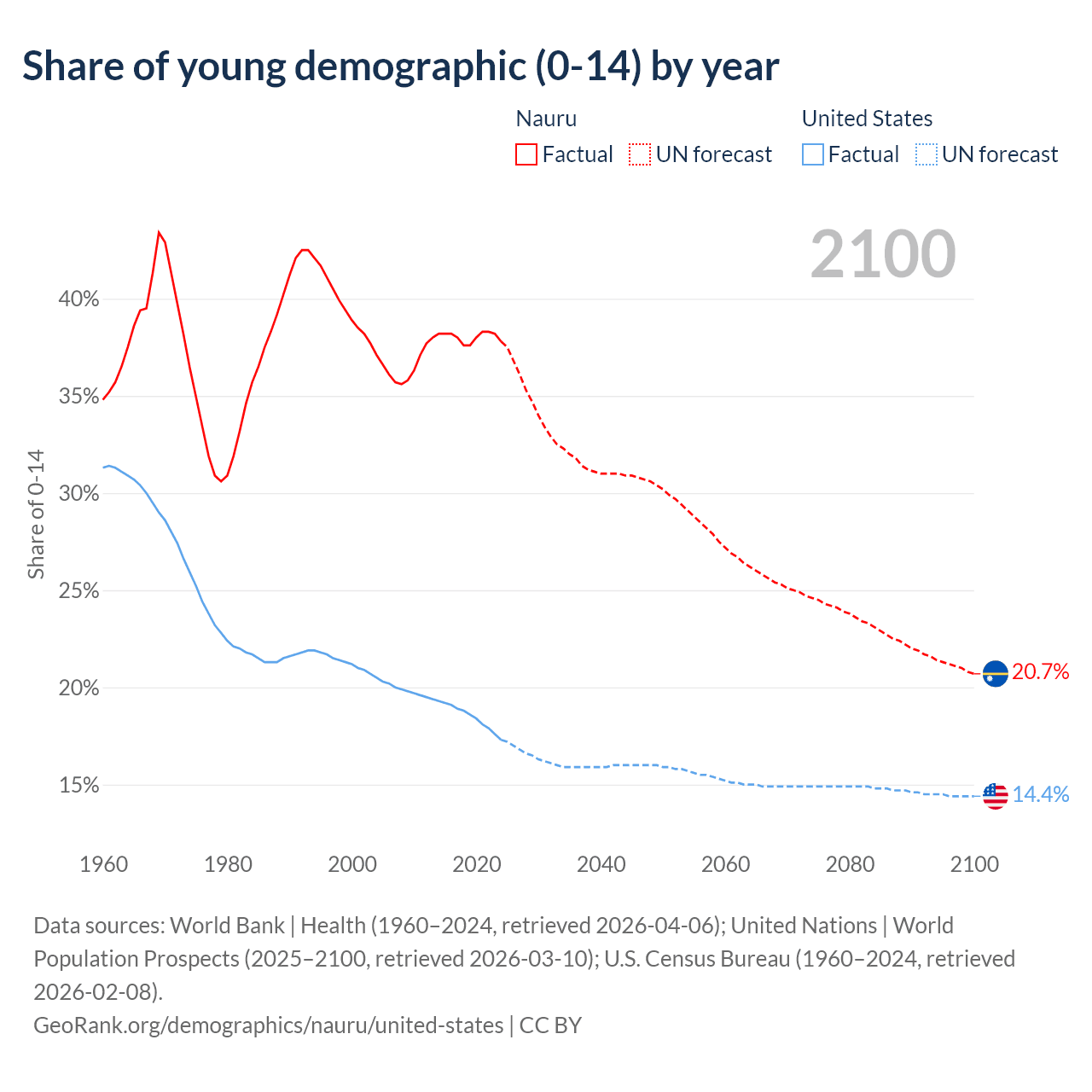 - The share of young demographic (0-15 years old) in Nauru is 37.8% vs 17.3% in the United States.
