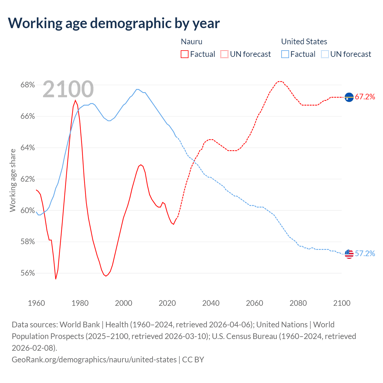 - Nauru has 7.2K working age adults (aged 15-64) vs 223M in the United States.