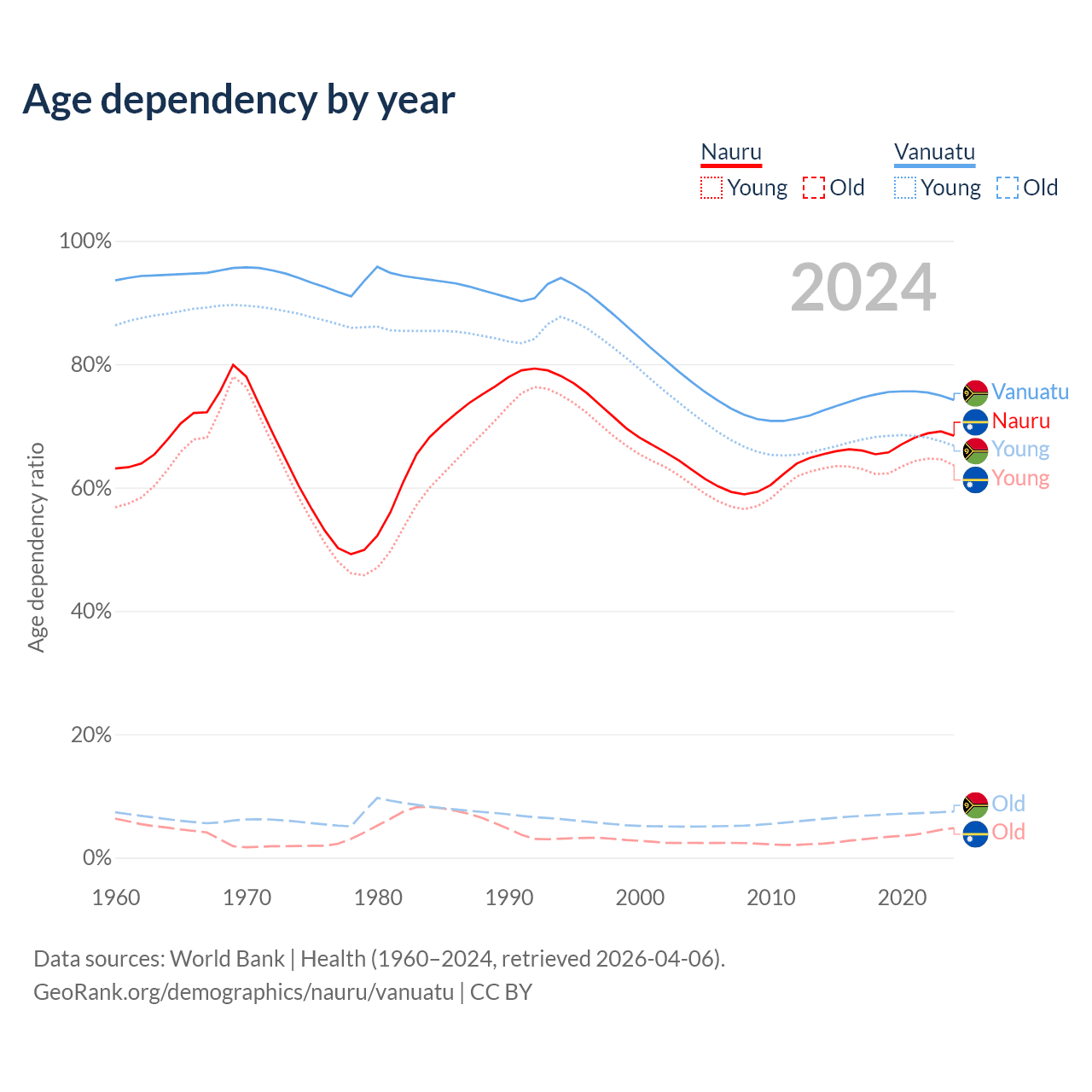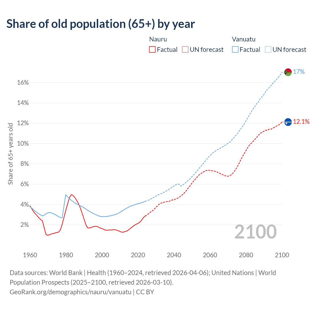The share of older people aged 65 and over is 2.85% in Nauru and 4.3% in Vanuatu. Life expectancy in Nauru compared to Vanuatu .