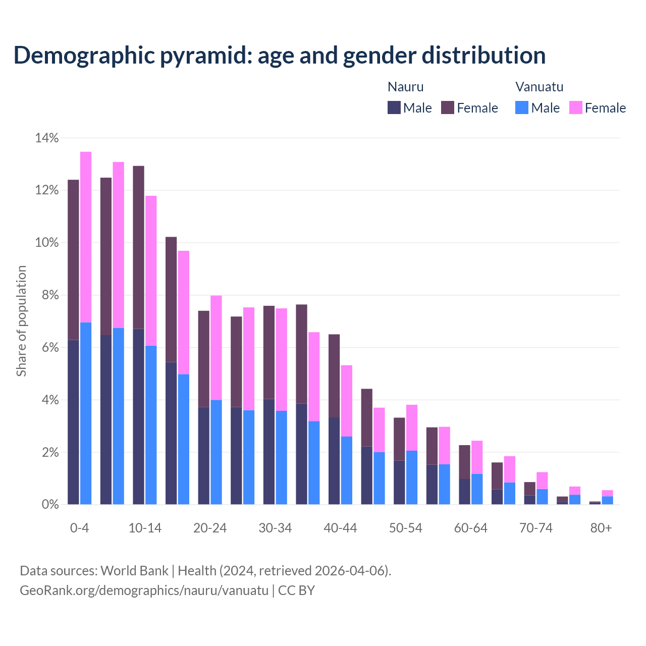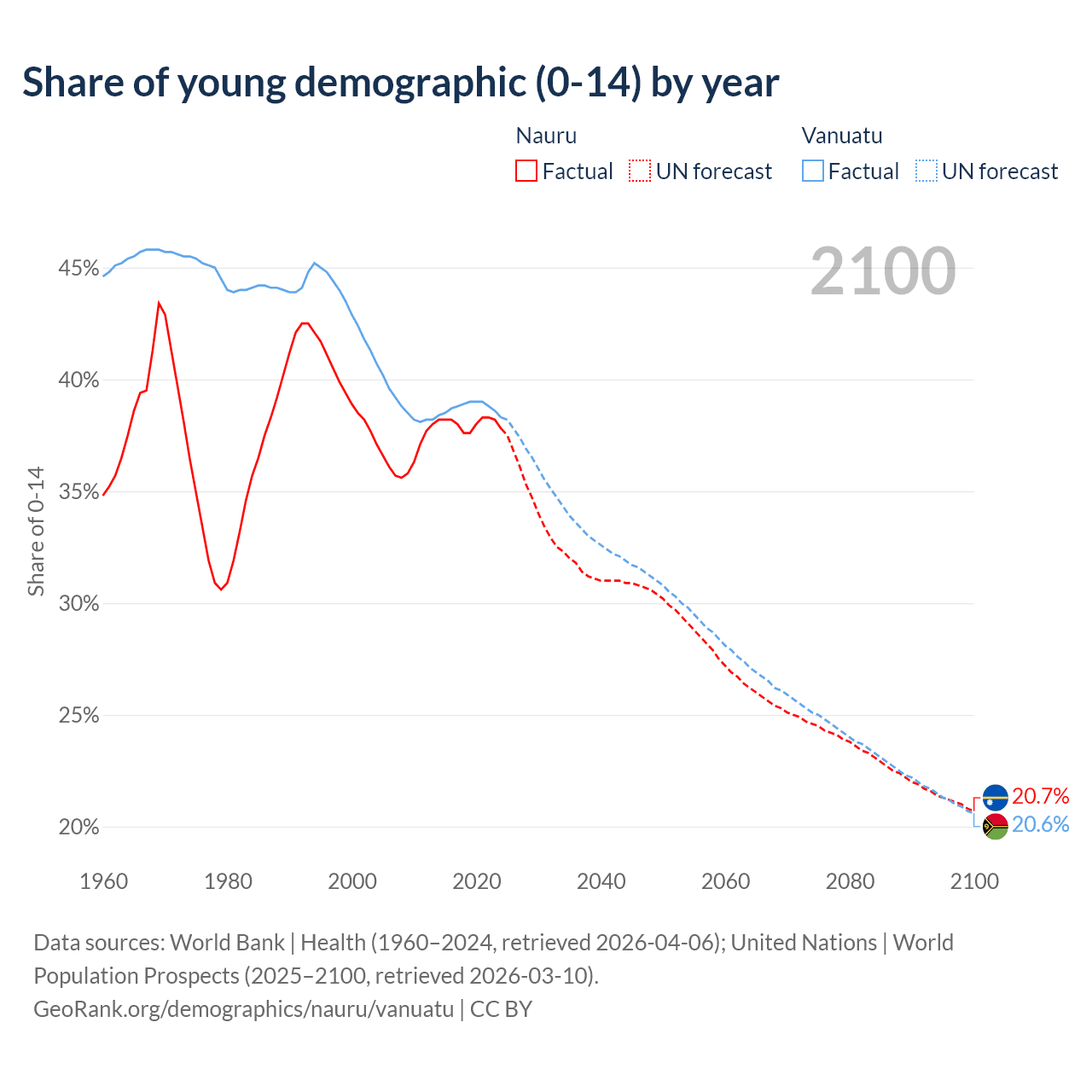 - The share of young demographic (0-15 years old) in Nauru is 37.8% vs 38.3% in Vanuatu.
