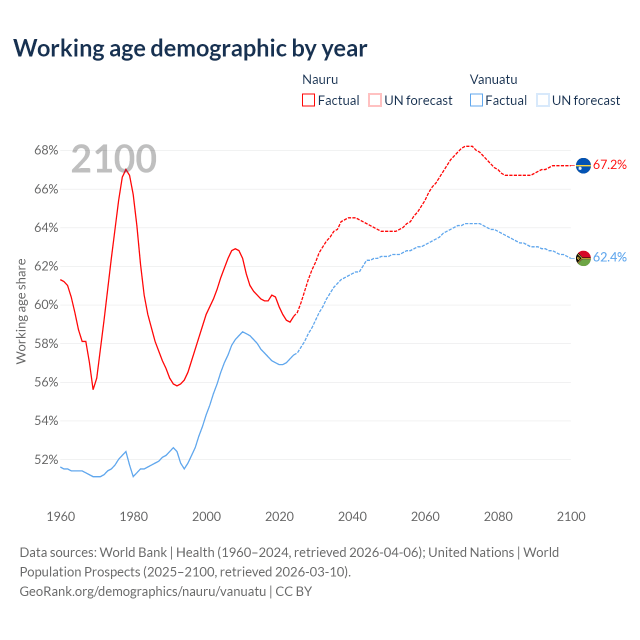 - Nauru has 7.2K working age adults (aged 15-64) vs 198K in Vanuatu.