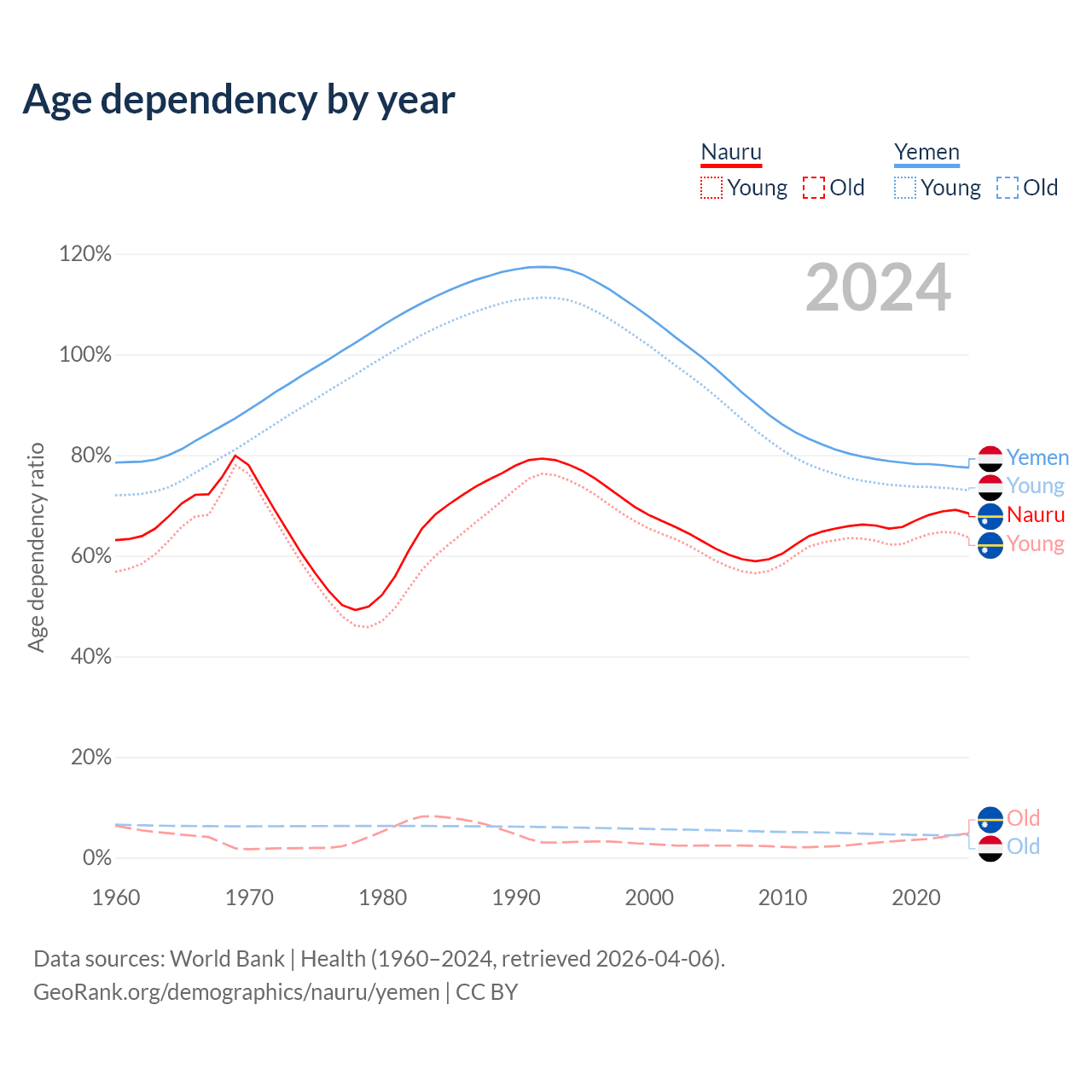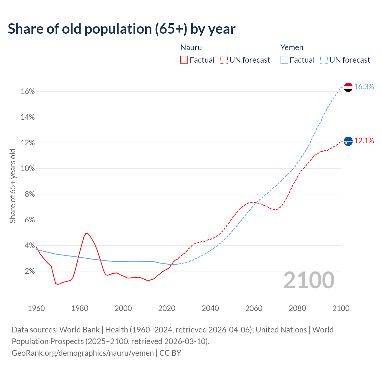 - The share of old-age demographic (65+) in Nauru is 2.85% vs 2.52% in Yemen.