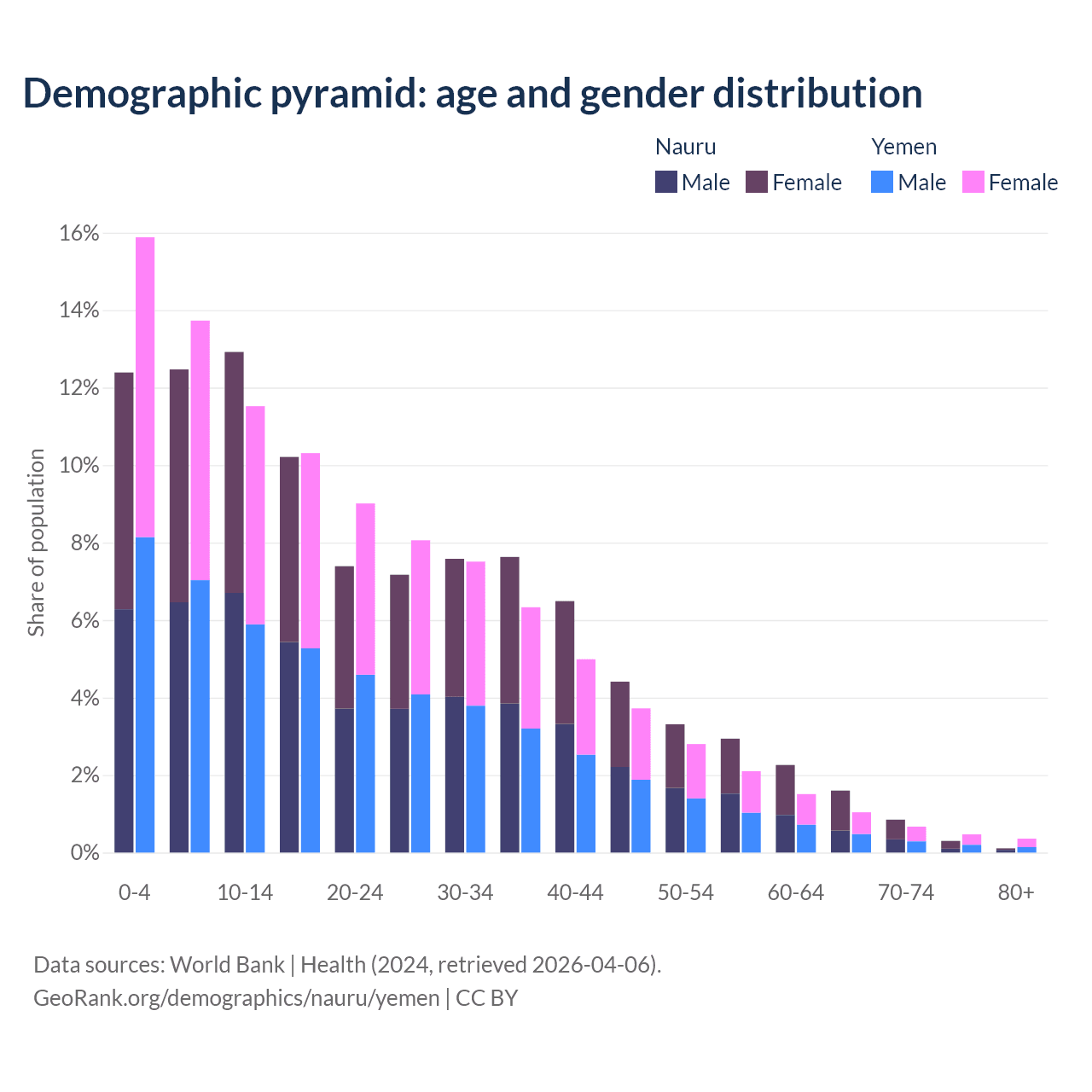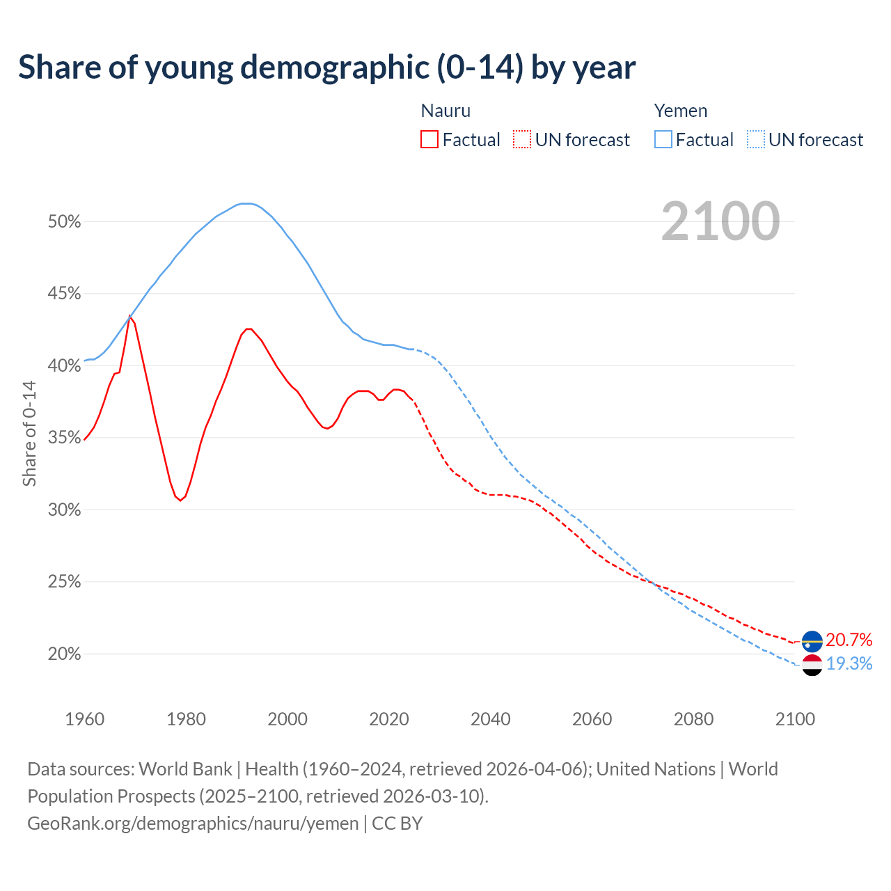 - The share of young demographic (0-15 years old) in Nauru is 37.8% vs 41.1% in Yemen.