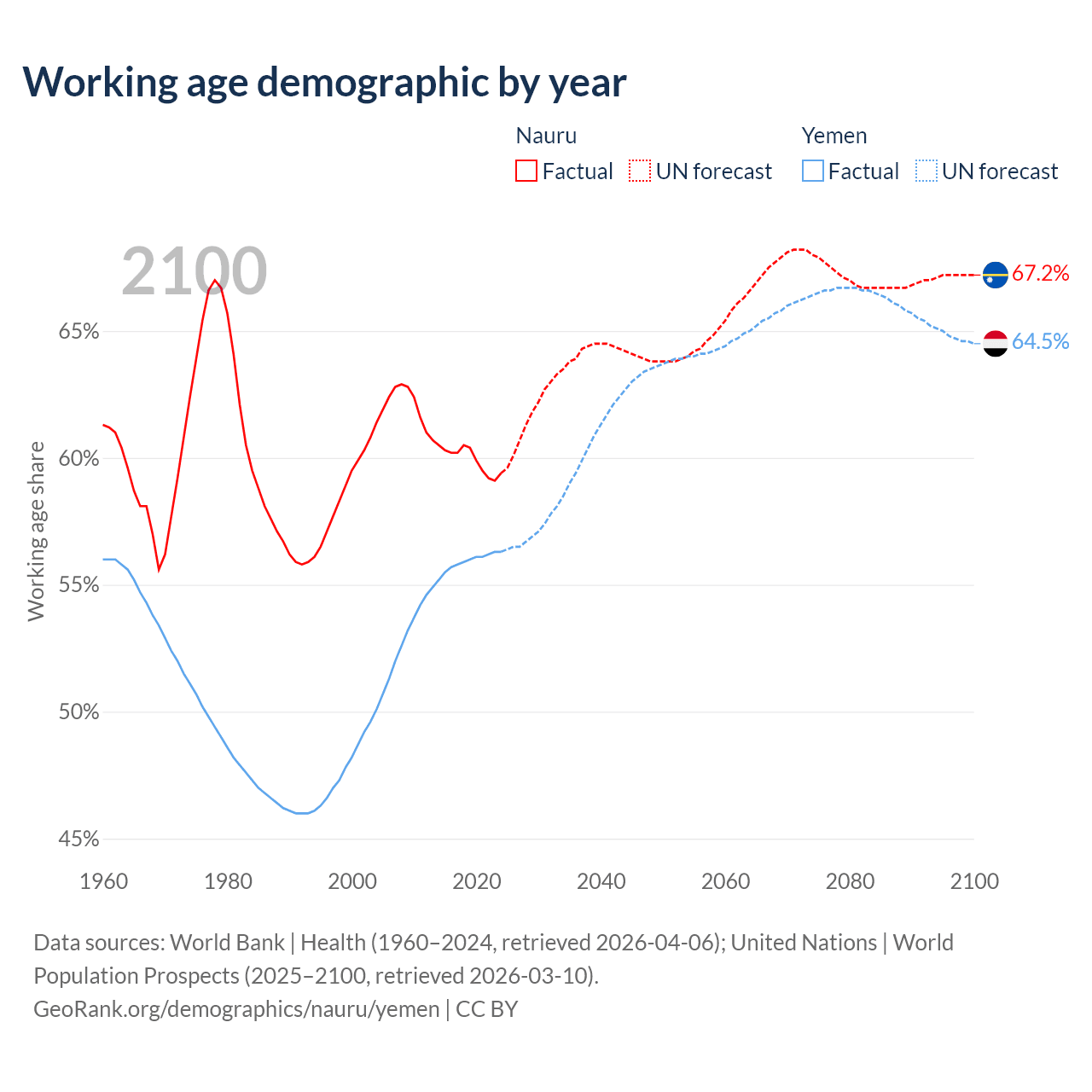 - Nauru has 7.2K working age adults (aged 15-64) vs 24.4M in Yemen.