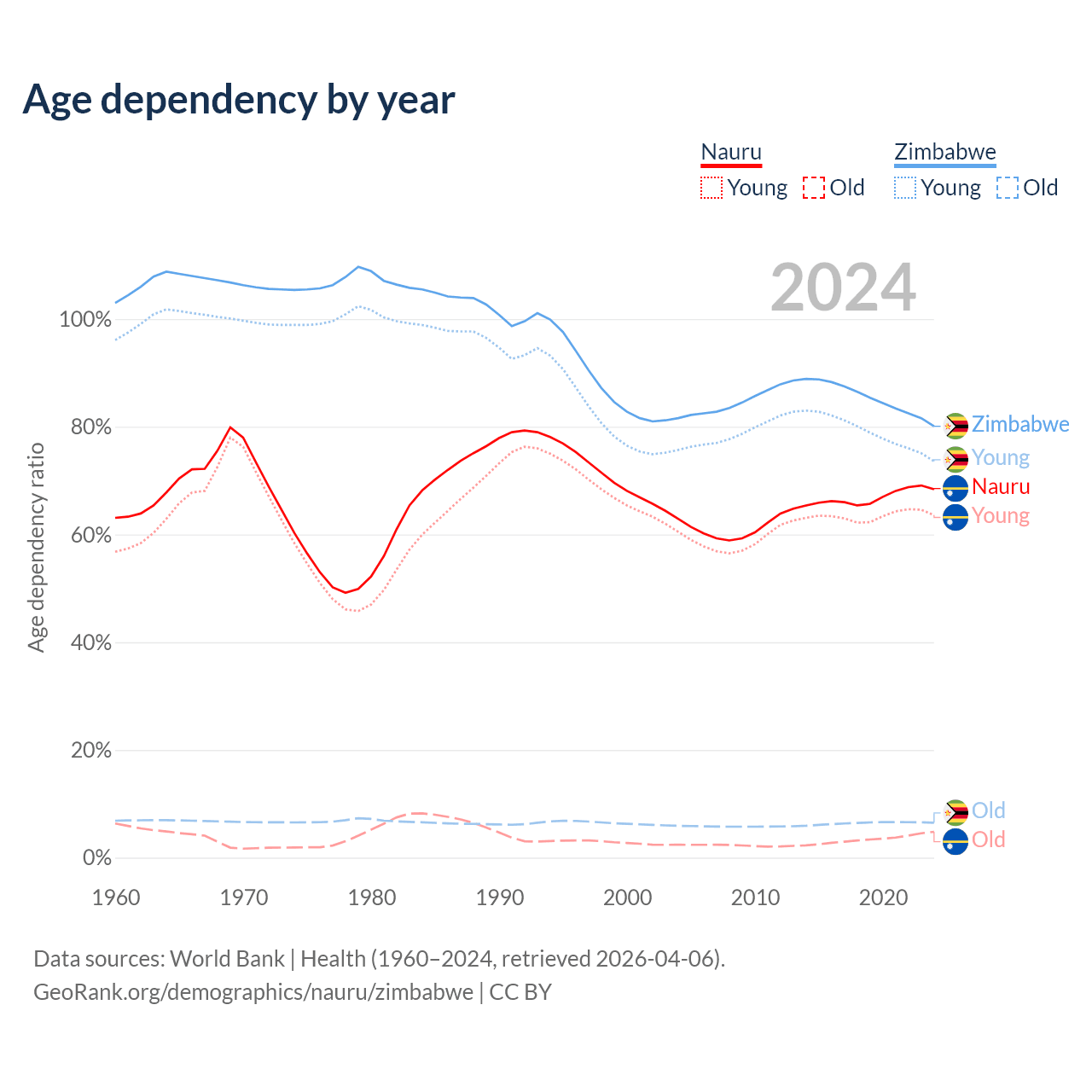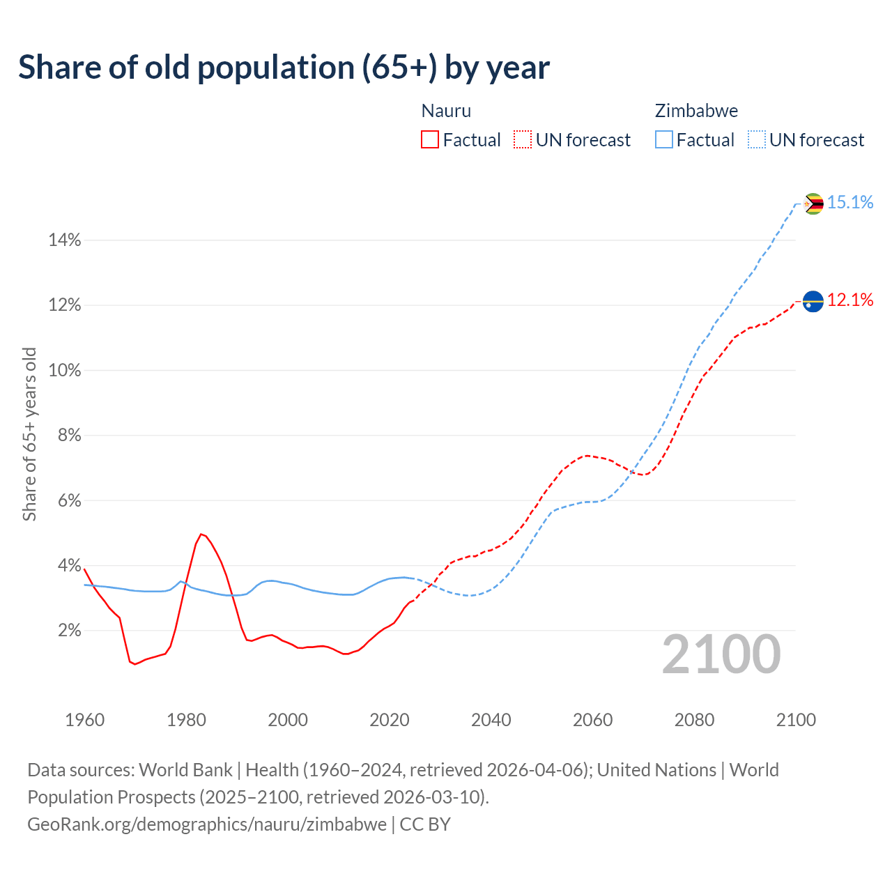 - The share of old-age demographic (65+) in Nauru is 2.85% vs 3.6% in Zimbabwe.
