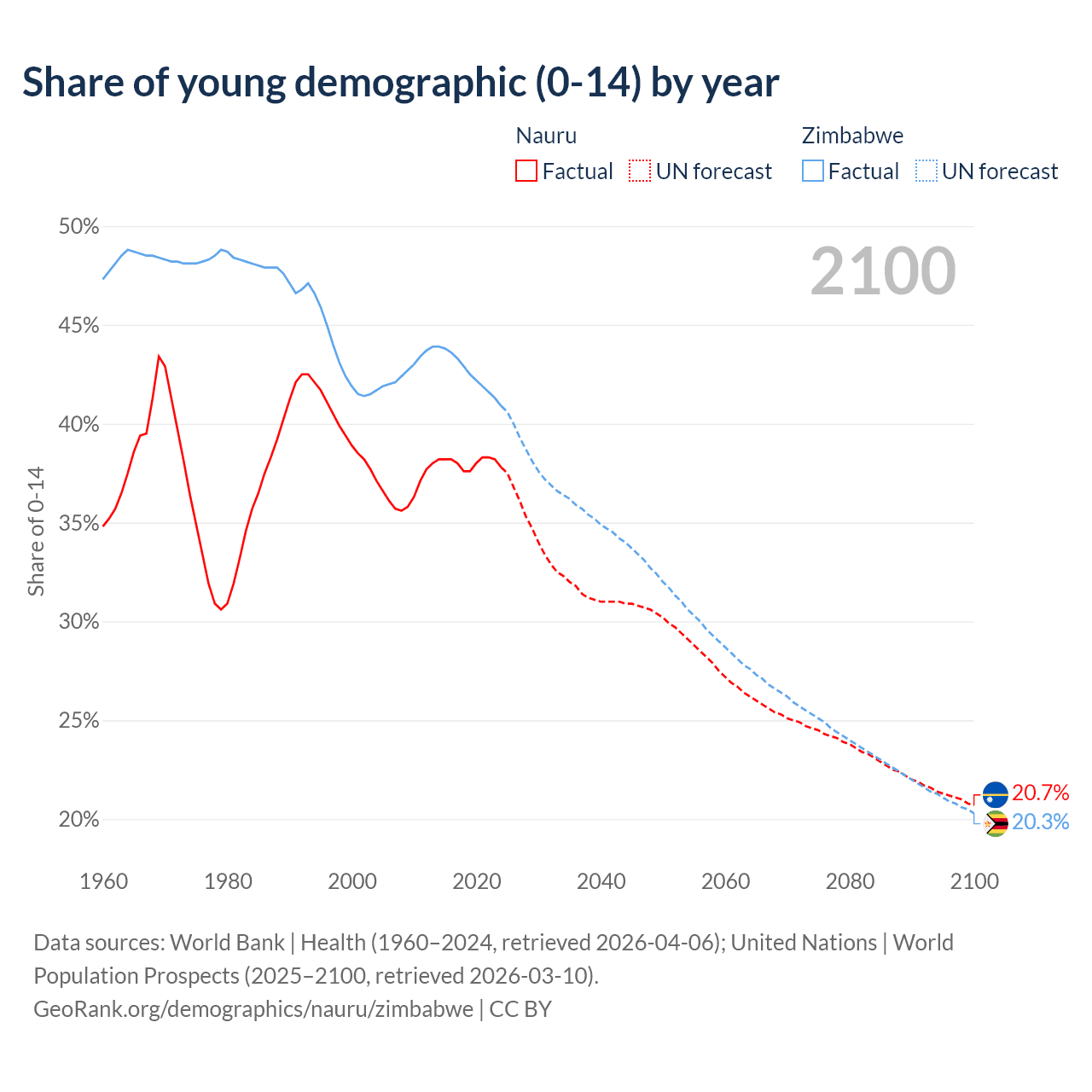- The share of young demographic (0-15 years old) in Nauru is 37.8% vs 40.9% in Zimbabwe.