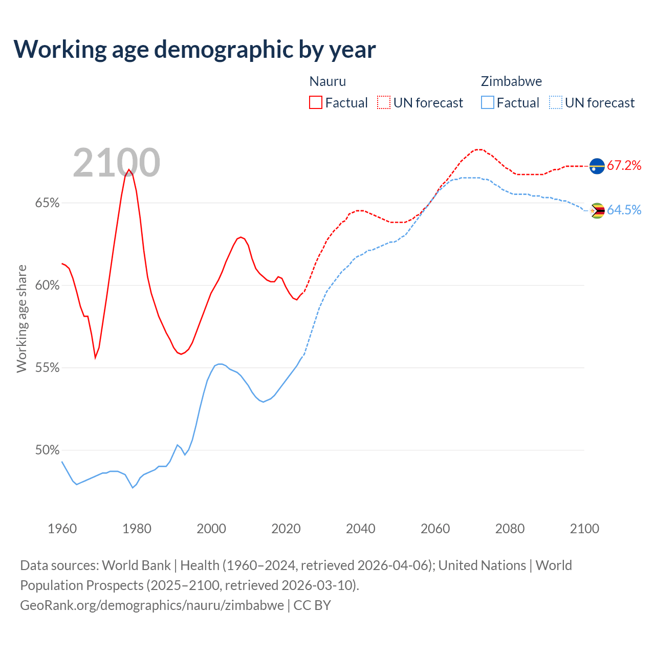 - Nauru has 7.2K working age adults (aged 15-64) vs 9.64M in Zimbabwe.