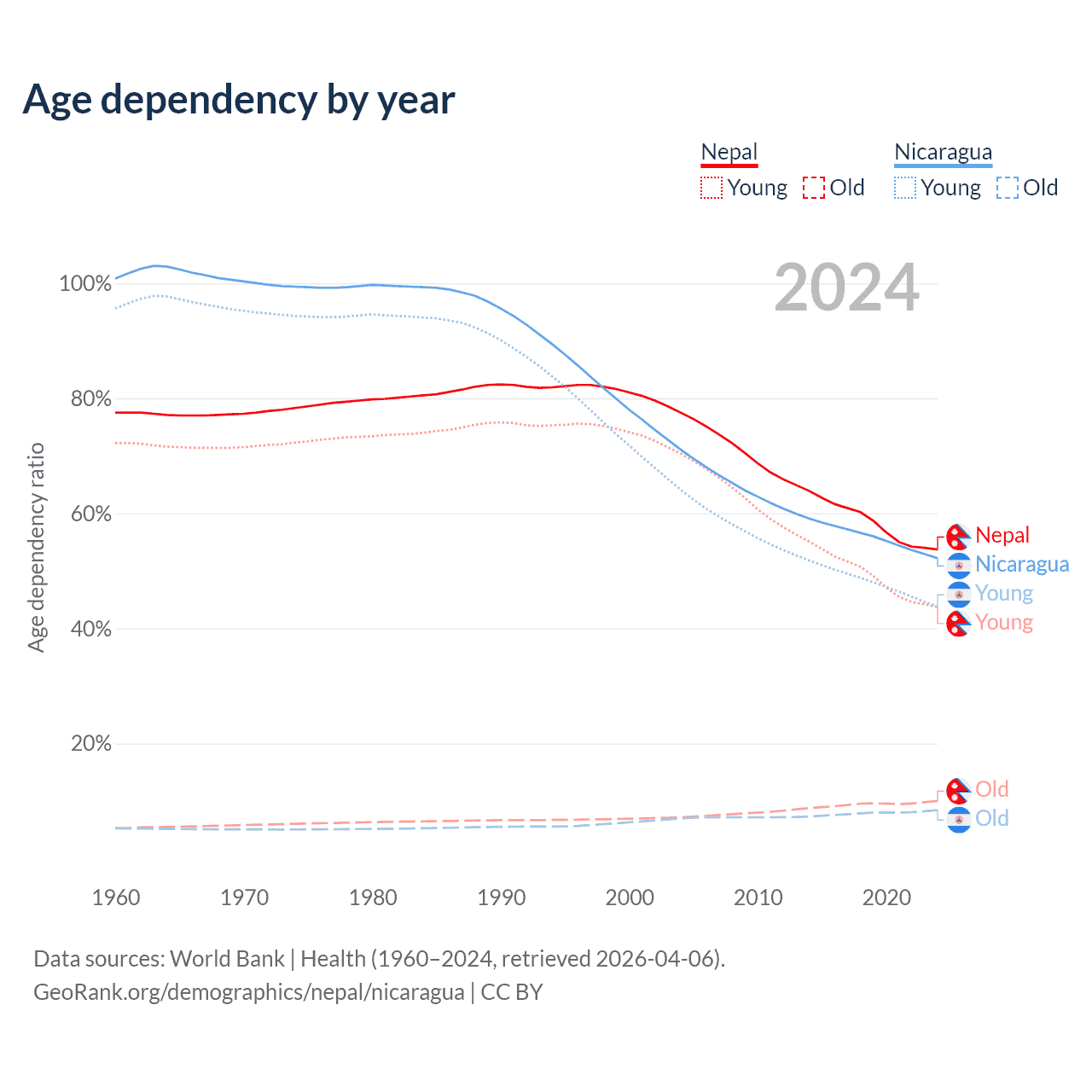 Data sources: World Bank | Health (1960–2024, retrieved 2026-04-06); U.S. Census Bureau (1960–2024, retrieved 2026-02-08).