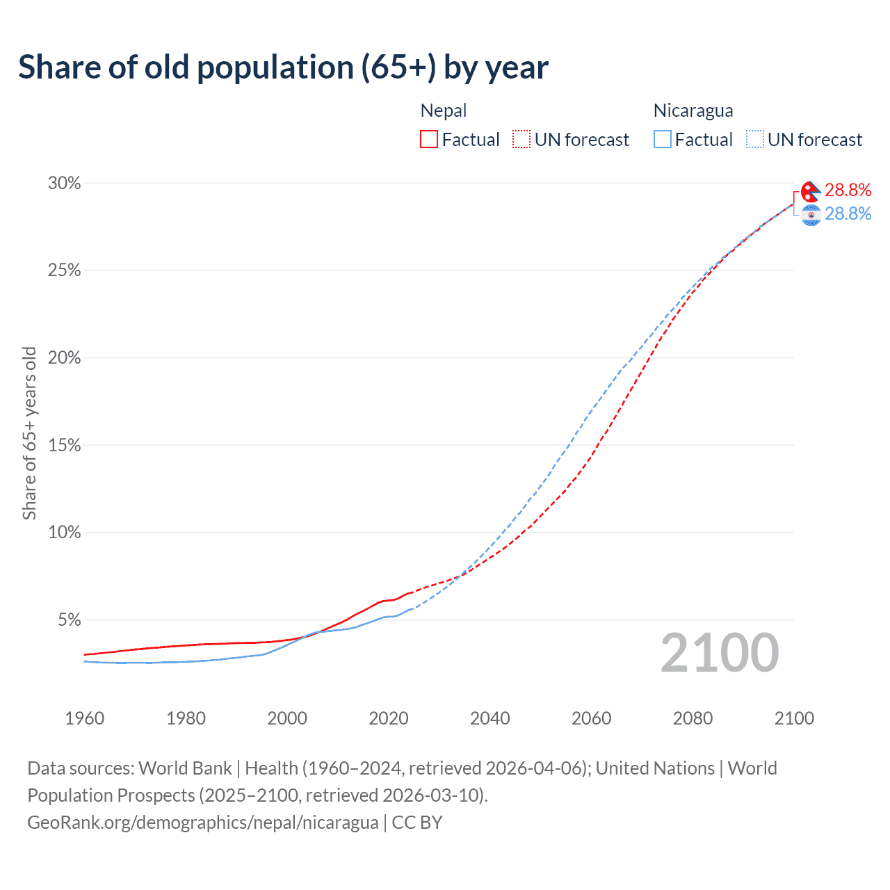 The share of older people aged 65 and over is 6.5% in Nepal and 5.53% in Nicaragua. Life expectancy in Nepal compared to Nicaragua .