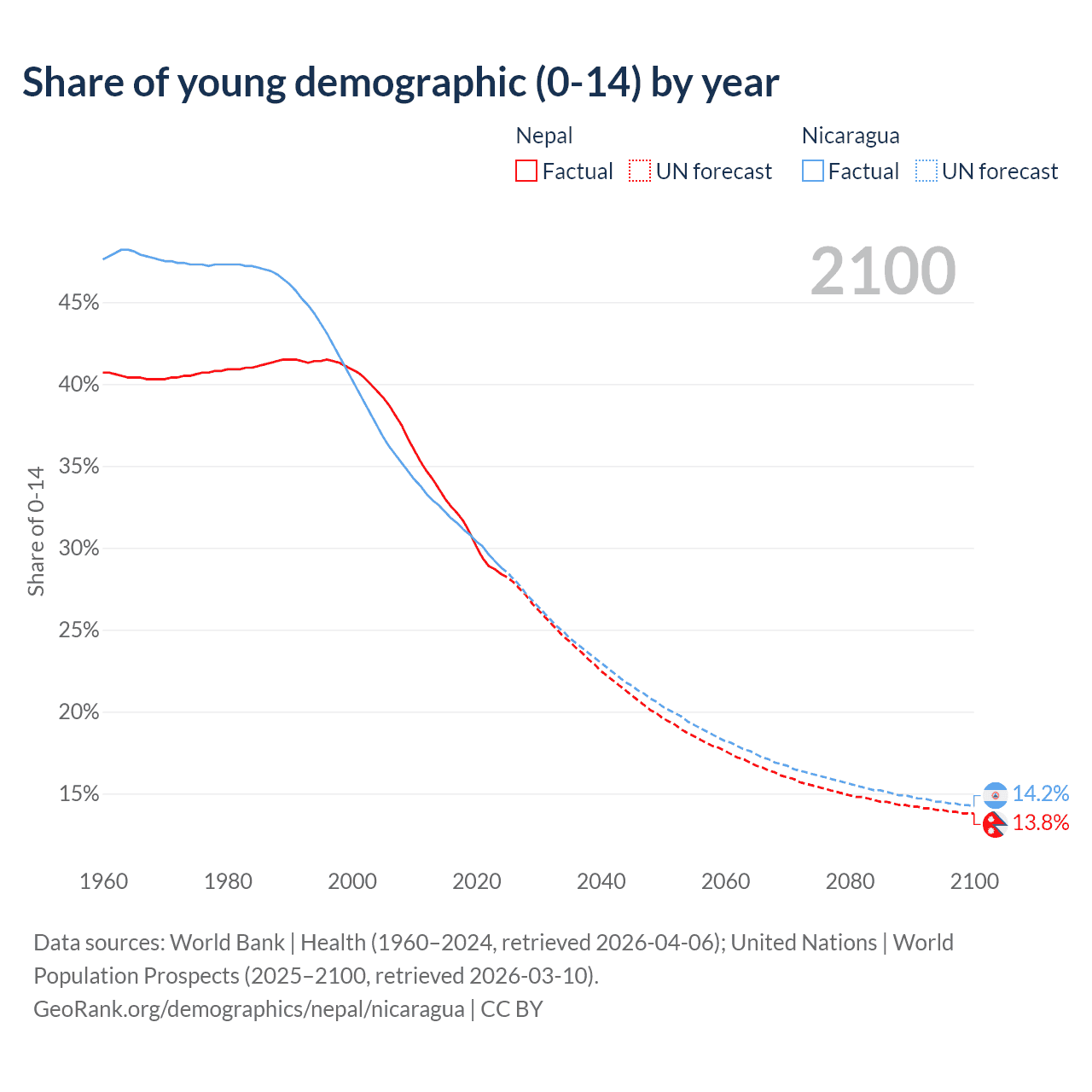 - The share of young demographic (0-15 years old) in Nepal is 28.4% vs 28.8% in Nicaragua.