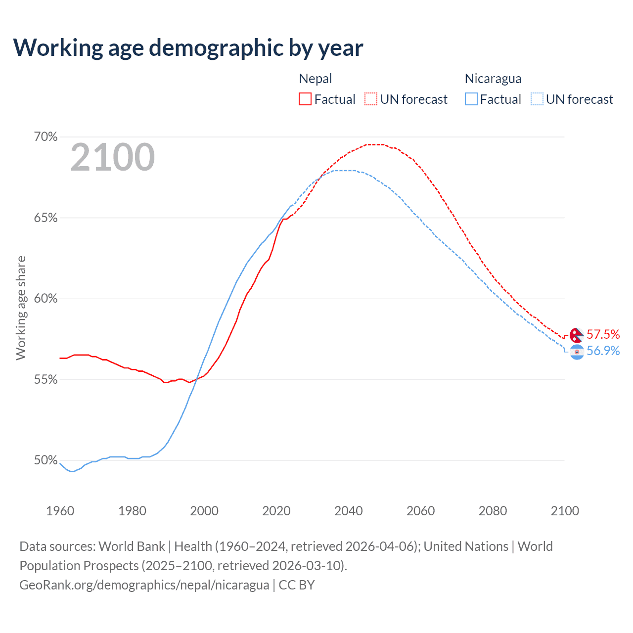 Median age Nepal vs Nicaragua, 1960-2100