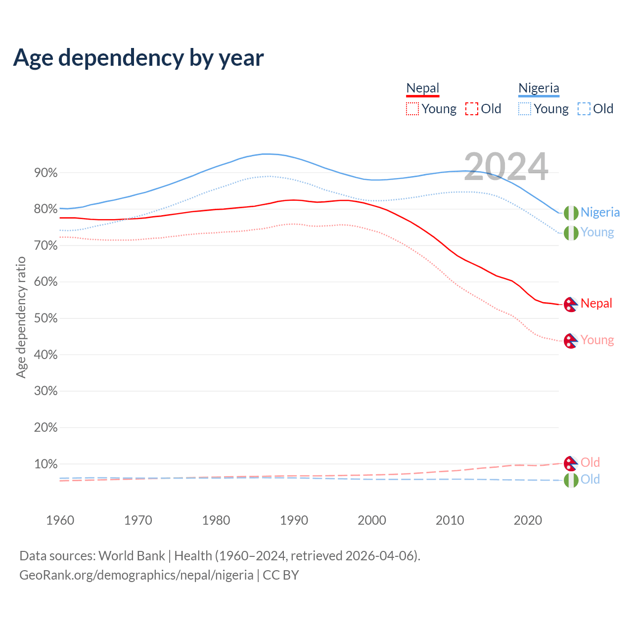 - Nepal is ranked 127/196 by median age (oldest to youngest) vs 178/196 for Nigeria.