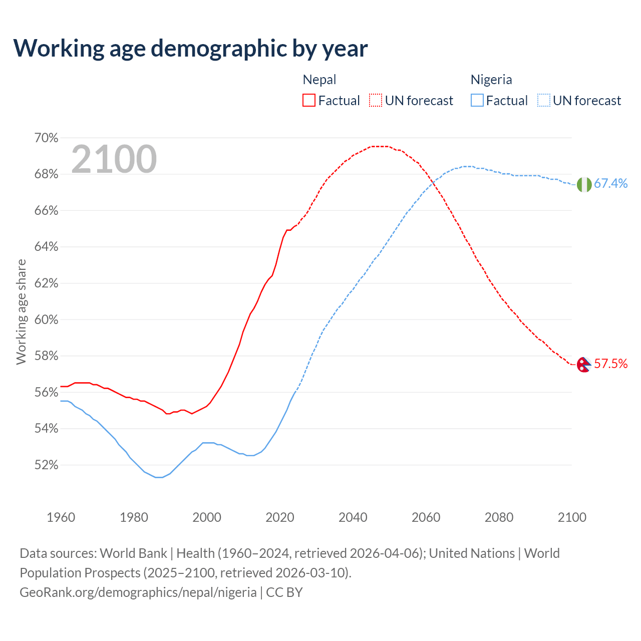 - Nepal has 19.3M working age adults (aged 15-64) vs 136M in Nigeria.