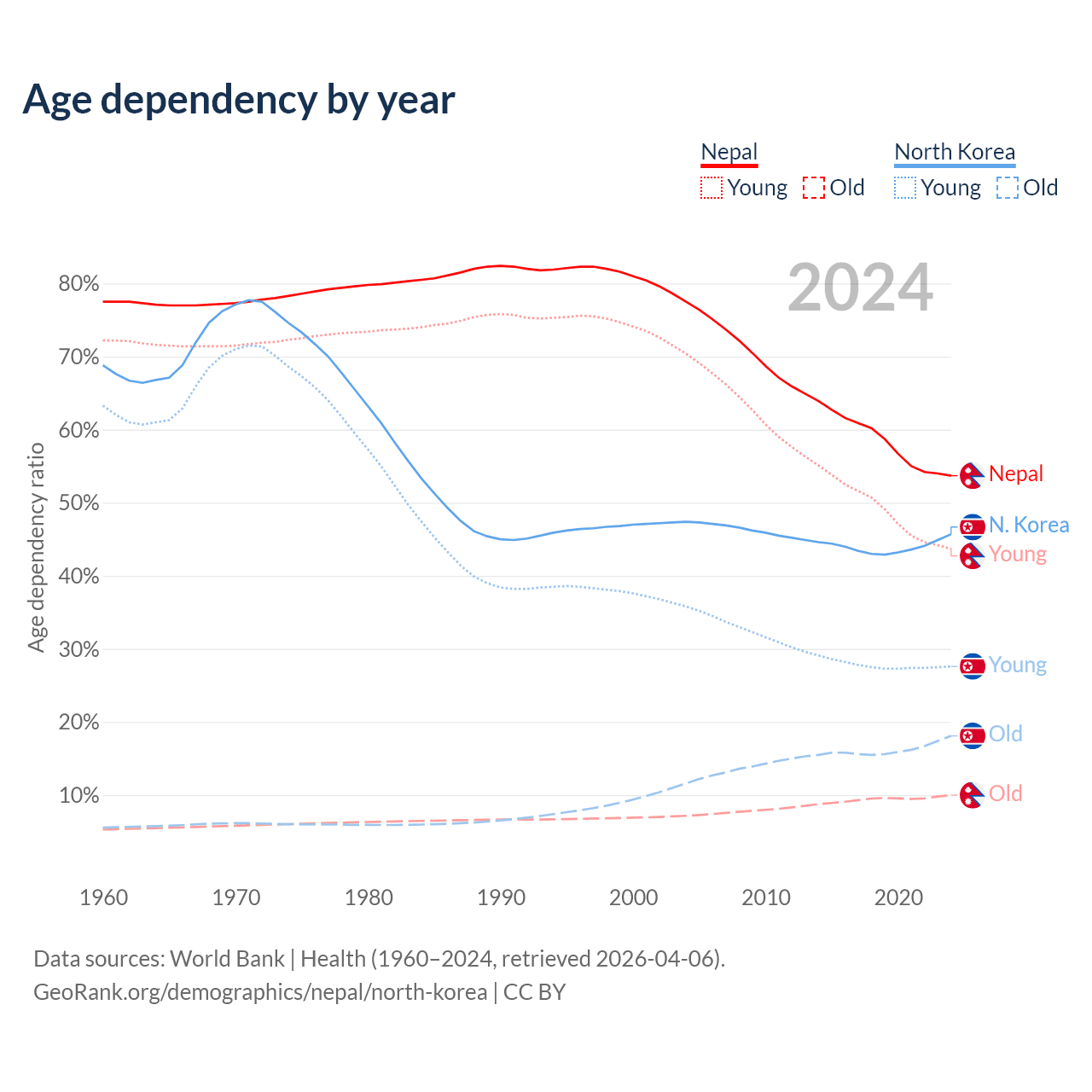 - The share of old-age demographic (65+) in Nepal is 6.5% vs 12.4% in North Korea.