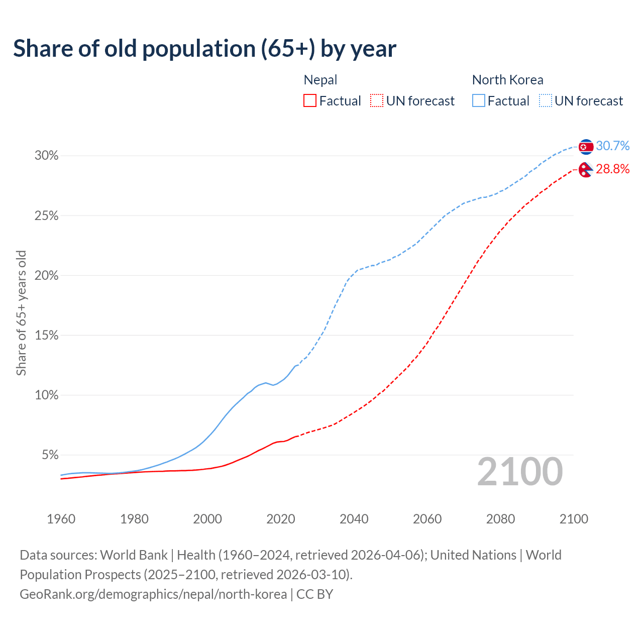 The share of older people aged 65 and over is 6.5% in Nepal and 12.4% in North Korea. Life expectancy in Nepal compared to North Korea .