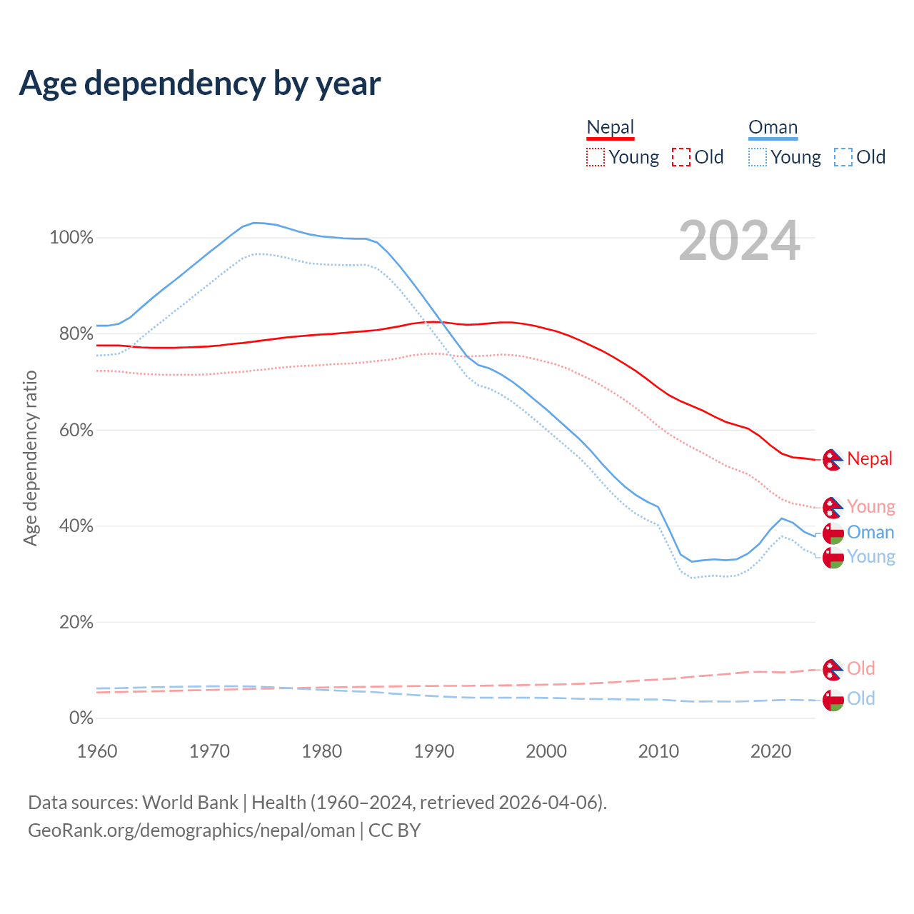 - Nepal is ranked 127/196 by median age (oldest to youngest) vs 101/196 for Oman.